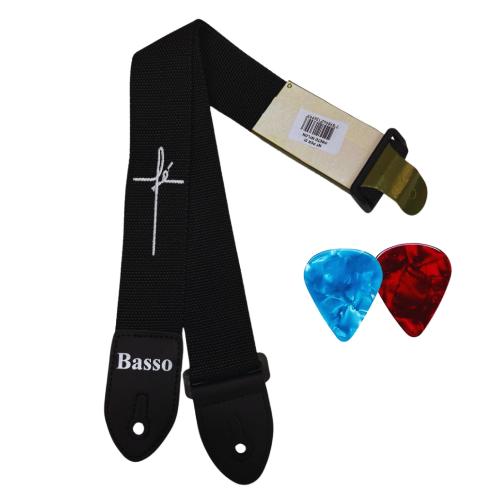 Correia Alça Basso- Bordada Fé Ny Per- Violão Guitarra Baixo + 02 Palhetas