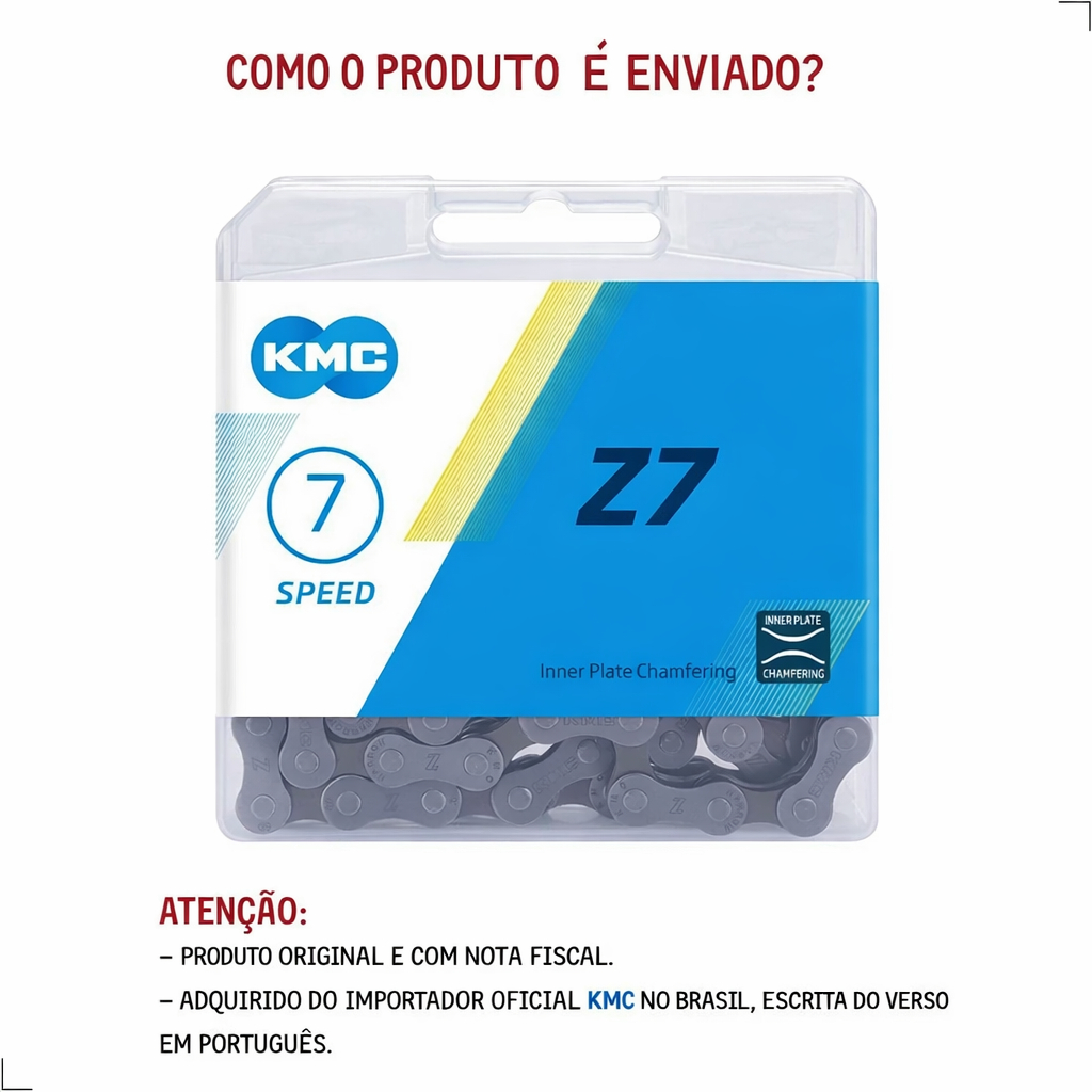 🚴♂️ CORRENTE KMC Z7 CINZA 116 ELOS – 7 VELOCIDADES (COM PINO DE EMENDA) Precisa de uma corrente confiável, silenciosa e durável para transmissão 7 velocidades? A KMC Z7 faz parte da linha Z Series, desenvolvida para quem busca custo-benefício com padrão profissional, mantendo a qualidade reconhecida da KMC. Indicada para MTB, Speed e uso urbano, é compatível com diferentes configurações de coroas e acompanha pino de conexão para instalação segura. 🔧 Principais Benefícios • Funcionamento silencioso e suave • Pinos reforçados, maior durabilidade • Tratamento contra estiramento prematuro • Compatível com coroa simples, dupla ou tripla • Ideal para uso urbano, recreativo ou esportivo • Excelente opção para manutenção e reposição 📌 Especificações Técnicas • Marca: KMC • Linha: Z Series • Modelo: Z7 • Velocidades: 7v • Medida: 1/2" x 3/32" • Quantidade de elos: 116 • Cor: Cinza • Peso aproximado: 360 g • Código de barras (EAN): 4715575883007 ⚙️ Tecnologias e Construção • Tratamento à prova de estiramento • Pinos no formato de arrebite, mais resistentes • Chanfro interno das placas para melhor encaixe • Placa externa com reforço em formato Z, aumentando a rigidez 🔗 Compatibilidade • Transmissões 7 velocidades • Configurações: 3x7v, 2x7v ou 1x7v • Bicicletas MTB, Speed e Urbanas ⚠️ Não compatível com sistemas 6v, 8v, 9v ou superiores 📦 Conteúdo da Embalagem • 1 Corrente KMC Z7 – 116 elos • 1 Pino de conexão ❗ Não acompanha Power Link (elo rápido) ℹ️ Observações Importantes • Produto original KMC • Acompanha embalagem original e nota fiscal • Recomenda-se instalação com ferramenta adequada para correntes