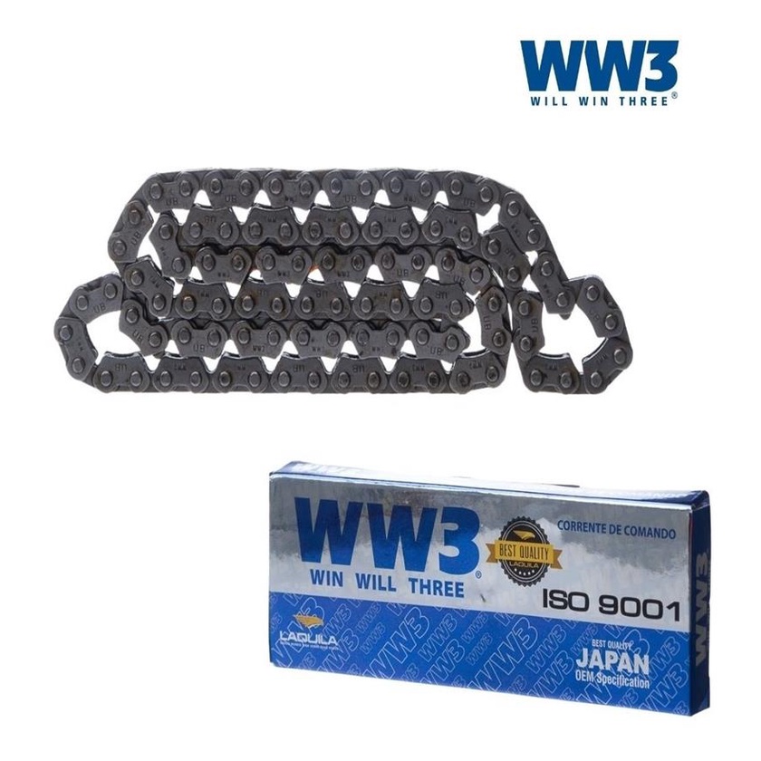 CORRENTE COMANDO WW3 94 ELOS Compatibilidade com os modelos: - CG 150 dos anos dos 2004 ,2005, 2006, 2007, 2008, 2009, 2010, 2011, 2012, 2013, 2014, 2015 - CG 125 2009/ - BROS 150 dos anos de 2006, 2007, 2008, 2009, 2010, 2011, 2012, 2013, 2014, 2015 - BROS 125 2013/ - BURGMAN 125 dos anos de 2005, 2006, 2007, 2008, 2009, 2010 As correntes de comando WW3 possuem um extremo processo de qualidade, pois sao fundamentais para o funcionamento correto do motor com toda essa necessidade de um produto de qualidade trouxemos as correntes de comando WW3 de alta qualidade.