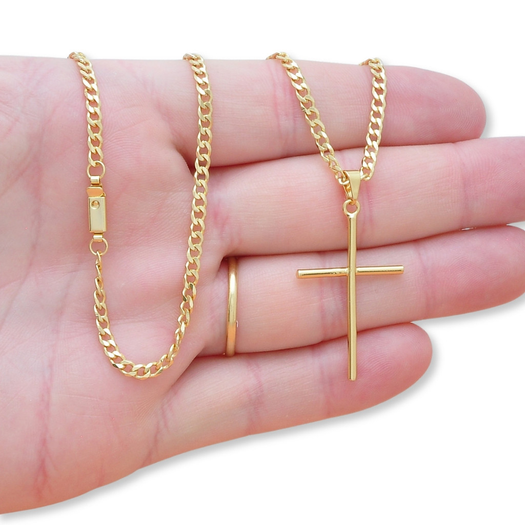 Corrente Cordão Masculina Grumet Pingente Cruz Palito 10 Camandas Banho Ouro 60cm Semi Joia Masculina