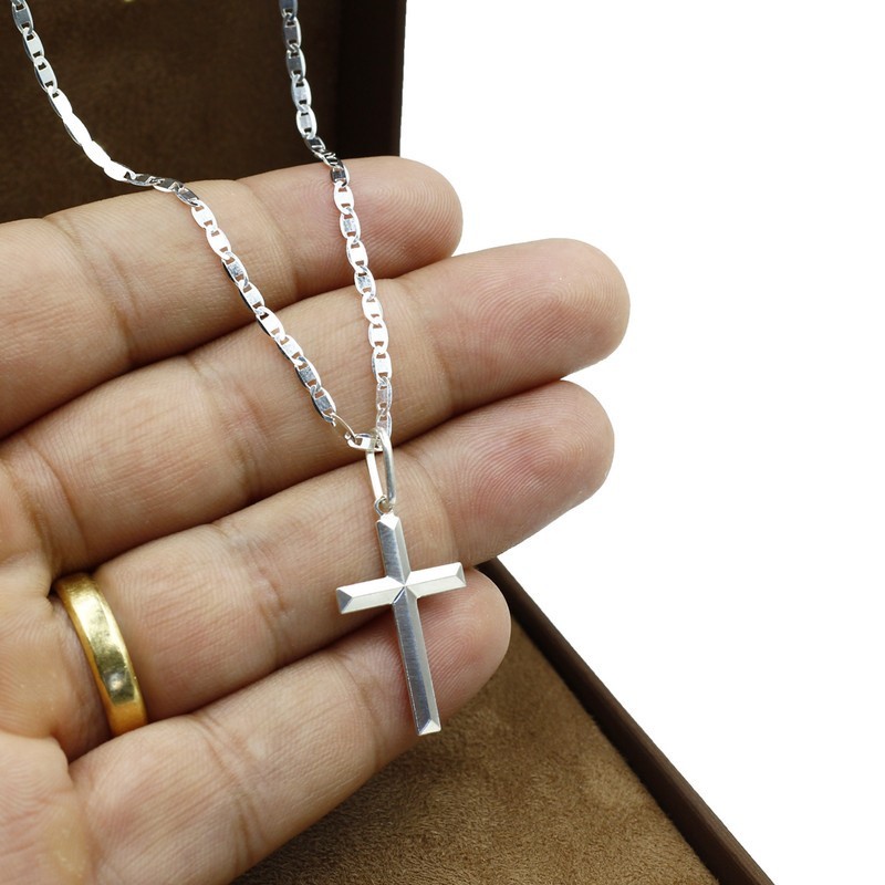 Corrente de Prata 925 Masculina Piastrine 60cm pingente crucifixo liso quinado