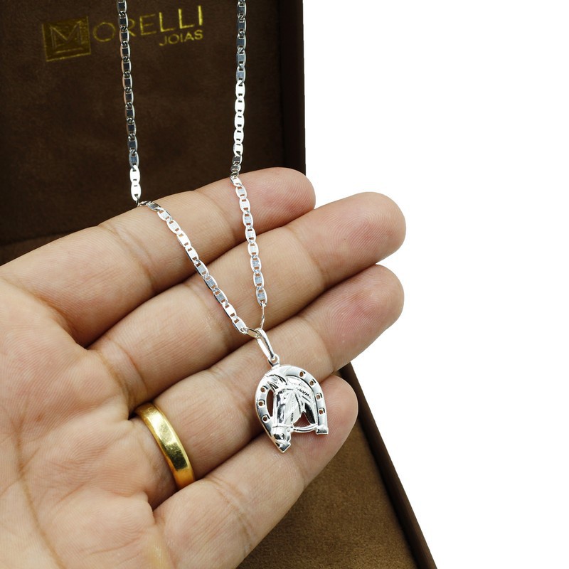 Corrente de prata 925 masculina Piastrine 70cm diamantada pingente Ferradura Cavalo
