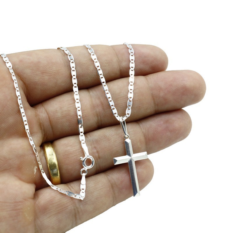 Corrente De Prata 925 Masculina Piastrine Pingente Crucifixo liso quinado