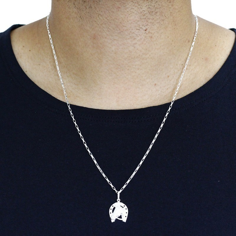 Corrente de Prata 925 masculina veneziana alongada 60cm pingente Ferradura Cavalo