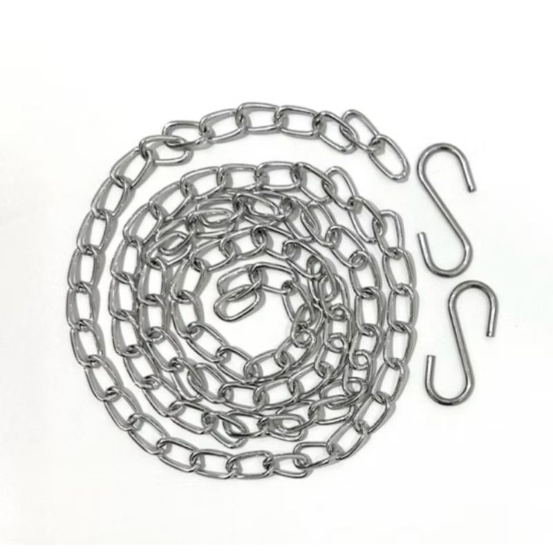 Corrente completa para pedal de mesa de máquina de costura industrial 1 metro 2 ganchos. - Serve em qualquer pedal de máquina de costura industrial. -Corrente de 1 metro, possui 2 peças S para conexão ao pedal e a máquina -Composição: Metal Itens Inclusos: -01 Corrente de 100cm -02 Ganchos