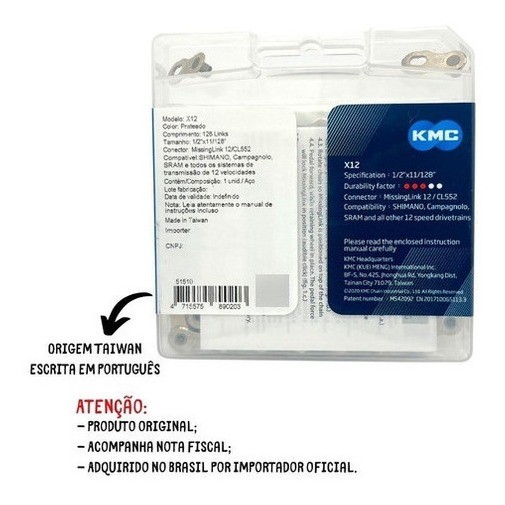 CORRENTE KMC X-12 SILVER (PRATA) - 12 VELOCIDADES - 126 ELOS Garanta trocas de marcha precisas e máxima durabilidade com a Corrente KMC X-12. Este é um produto original, enviado na embalagem de fábrica, garantindo a qualidade e procedência que a sua transmissão de 12 velocidades exige. Com 126 elos, ela possui o comprimento ideal para as modernas transmissões de MTB com cassetes grandes (50 ou 52 dentes), sem ficar curta. Equipada com a tecnologia Double X Bridge, seus elos chanfrados proporcionam um encaixe perfeito nos dentes da relação, resultando em trocas mais rápidas, silenciosas e seguras. ✅ PRINCIPAIS BENEFÍCIOS: Tecnologia XX Bridge: O desenho em X na placa externa garante compatibilidade total e trocas de marcha mais suaves e rápidas. Alta Durabilidade: Tratamento especial nos pinos e placas para resistir ao torque das subidas íngremes. Tamanho Ideal (126 Elos): Comprimento suficiente para montar em relações com cog de 50, 51 ou 52 dentes sem problemas. Praticidade: Acompanha o Missing Link (Power Link) original CL552, dispensando ferramentas para fechar a corrente. Produto Original: Vai na caixinha original KMC com número de série (evite falsificações que quebram no pedal). ⚙️ ESPECIFICAÇÕES TÉCNICAS: Marca: KMC Modelo: X12 Silver Cor: Prata (Silver) com pinos polidos Velocidades: 12 Velocidades (1x12) Medida: 1/2" x 11/128" Quantidade de Elos: 126 Links Peso: Aprox. 268g Tecnologias: Double X Bridge / Non-Directional (Não tem lado certo de montagem) Conector: Acompanha Missing Link 12/CL552 🚲 COMPATIBILIDADE: Compatível com todos os sistemas de transmissão de 12 Velocidades do mercado. Shimano (Deore M6100, SLX M7100, XT M8100, XTR M9100). SRAM (Eagle SX, NX, GX, X01, XX1). Outras marcas: Sunrace, Absolute, X-Time, GTA (desde que sejam 12v). 📦 O QUE VEM NA EMBALAGEM: 01 Corrente KMC X12 Silver Original (126 elos). 01 Power Link (Emenda rápida) CL552. Manual de instruções na caixa. ❓ PERGUNTAS FREQUENTES (FAQ): 1. O produto é original? Vem na caixa? R: Sim, trabalhamos apenas com produtos originais KMC. A corrente vai na embalagem plástica rígida original de fábrica. 2. Serve em cassete de 52 dentes? R: Sim! Por ter 126 elos, ela é perfeitamente compatível com cassetes grandes de 50, 51 e 52 dentes, servindo na maioria dos quadros modernos. 3. Serve para 11 velocidades? R: Não. Esta corrente é mais fina, específica para 12 velocidades. Se usar em 11v, ela pode não encaixar corretamente nos dentes ou romper. 4. Precisa de ferramenta para fechar a corrente? R: Não necessariamente para fechar, pois ela acompanha o Power Link (emenda rápida) que pode ser travado tensionando o pedal. Porém, para cortar a sobra de elos (ajustar o tamanho), você precisará de uma chave de corrente. 5. Qual a diferença da X12 para as correntes comuns? R: A durabilidade e a tecnologia de chanfros (X-Bridge). A KMC X12 é desenhada para aguentar a torção cruzada que ocorre nas relações de 12 velocidades (do cog 10 ao 52), oferecendo vida útil superior a modelos de entrada. 🚀 Envio rápido. Produto Original KMC para máxima performance! 💬 Tem dúvida sobre a compatibilidade? Pergunte abaixo!