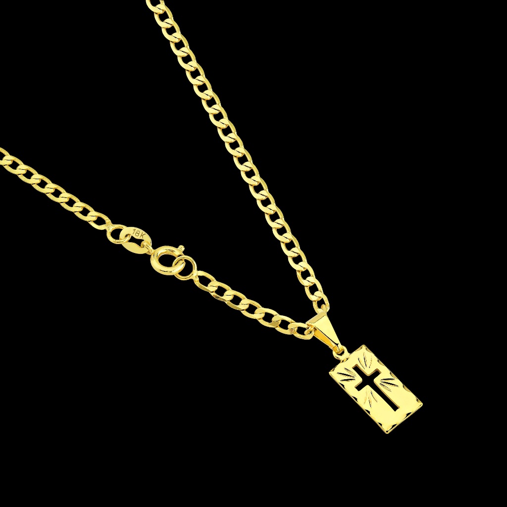 Corrente Masculina Grumet + Pingente Placa Cruz Banhados a Ouro 18k Cordão Fino Correntinha