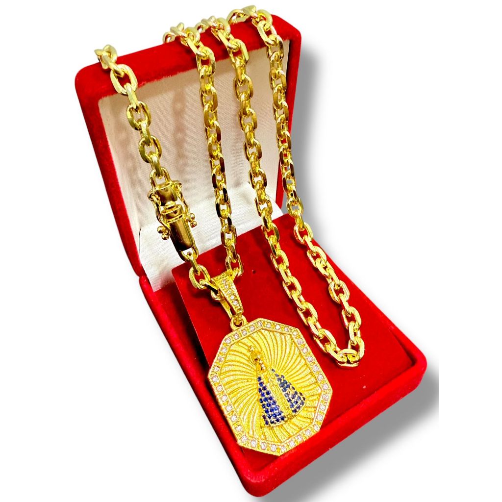DESCRIÇÃO DO PRODUTO: Saquinho para acomodar joias. Metal: banhado em ouro 18k (10 camadas em ouro) Tipo de Corrente: CADEADO 5 mm Tipo de Fecho: GAVETA PREMIUM 3 TRAVAS Tamanho da Corrente: 70 Peso da corrente: 27g Tipo de Pingente: NOSSA SENHORA CRAVEJADO Peso do Pingente: 14g Tamanho do Pingente: 3cmx2,5cm Premium Golds - Camada de Ouro muito mais espessa. - Aspecto visual semelhante a jóias de ouro maciça. ---------------------------------------------------------------------------------------------------------- Usamos e fazemos semi jóias banhadas por serem as melhores opções disponíveis atualmente. E nós da Premium Golds temos o melhor banho em Ouro 18k da melhor qualidade e eficiência. - Semi jóias banhadas em OURO AMARELO 18k, - ALTAMENTE polida e brilhante, - Banho MUITO MAIS RESISTENTE que qualquer outra semi jóia, - Confiamos na QUALIDADE E DURABILIDADE dos nossos produtos, - Por isso damos com total segurança GARANTIA DE 1 ANO referente ao banho. NOSSAS JOIAS SÃO FABRICADAS COM LIGA DE METAIS MAIS EFICAZES PARA ABSORÇÃO E FIXAÇÃO DO OURO DURANTE O PROCESSO DE BANHAR! ----------------------------------------------------------------------------------------------------------- Utilizamos um processo que se chama ***GALVANOPLASTIA***, responsável pela aderência da camada de Ouro " Metal Nobre " a peça base ( feito por imersão ). Utilizamos também banhos que define polimento, brilho e acabamento; o que garante a beleza e a elegância das Semi Jóias Nosso banho de cobre alcalino garante para as nossas semi jóias uma textura acetinada e brilhante.