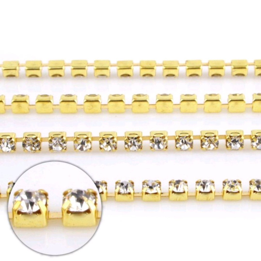 Corrente Strass 2mm 2,2mm 3mm 6mm Ss6,5 Ss8,5 Ss12 Ss16 Ss28 - Ouro Prata - Pedra Cristal