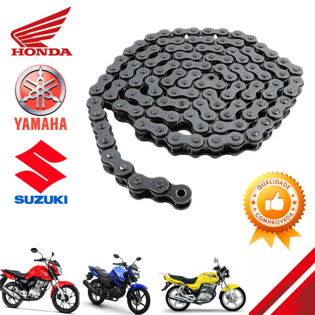 Descrição CORRENTE PARA KIT DE TRANSMISSÃO - Produtos conferidos na hora do envio por uma equipe especializada! APLICAÇÃO: Modelo 428X 118L Conteúdo: 01 Corrente de Transmissão. Com opção de compra de 01 Par de Esticador (02 unds) Titan 150 (EXCLUSIVO PARA TITAN 150 2004 EM DIANTE) Honda: -Cg 125 Fan / Cargo 2014 -Fan/Titan Todas -Titan 150 2014 -Cg Titan 160 Yamaha: Ybr/Factor até 05 Ybr 125 99 -05 Ybr 125 06-09 Rdz 125 97-00 Suzuki: Gsr 125/s13