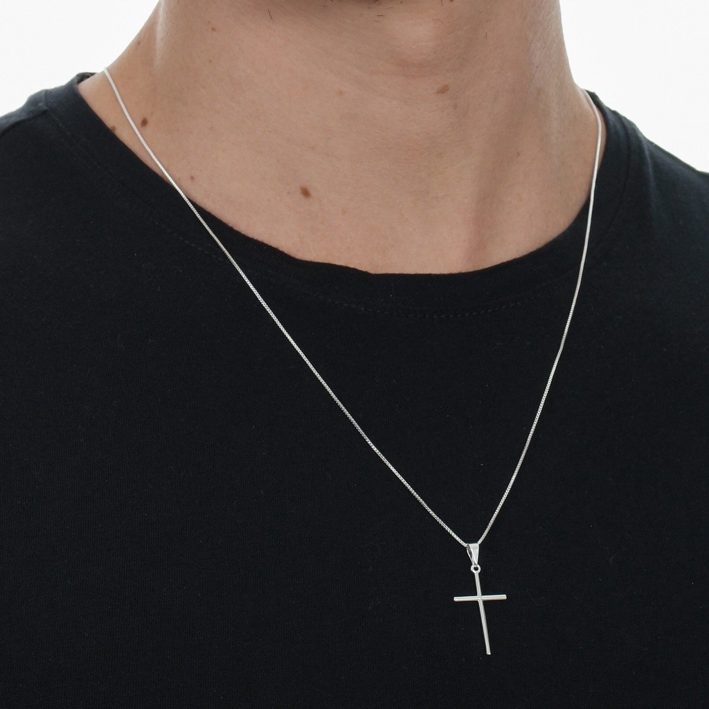 Corrente Veneziana + Pingente Cruz Palito Banhado a Prata 925 Cordão Masculino Correntinha com Crucifixo
