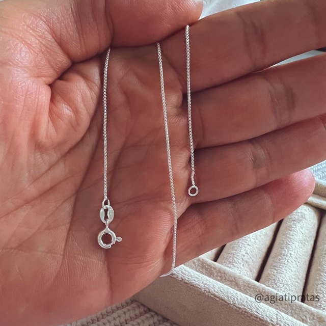 Corrente veneziana em prata 925 legítima com garantia vitalícia Temos disponíveis 19cm (pulseira ) , e correntes de 40, 45, 50 e 60cm *Prata Legitima 925 acompanha certificado garantia *Há mais de 20 anos no mercado *Fotos Reais dos Produtos* *Envio Rápido* PERGUNTAS FREQUENTES: É prata mesmo ou é banhado? A Agiati Pratas é uma loja especializada em Joias de Prata de Lei Teor 925. Não trabalhamos com peças banhadas, somente prata legitima. Tem garantia? Nossas joias são feitas para durar a vida toda.Todas as nossas peças acompanham certificado de autenticidade com garantia vitalícia do metal. A peça vai escurecer? Faz parte do processo natura da Prata oxidar, mas não quer dizer que a sua joia estragou. É só limpar com limpa prata de sua preferencia e utilizar a flanela magica limpa prata para polimento. Sua joia volta a brilhar novamente. É antialergico? Na composição das nossa prata não há níquel, metal no qual causa alergia em algumas pessoas. Portanto, se você é alérgica a níquel (presente nas bijuterias), não, nossas joias não causarão alergia em você.