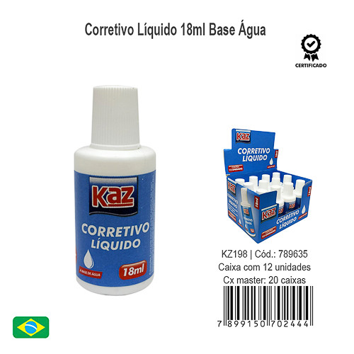 Corretivo Liquido Escolar 18ml Kaz O Corretivo Líquido de 18ml da Kaz é feito à base de água, não tem cheiro, é lavável e sua secagem é rápida, pronto para uso. Não tóxico. KZ 198 Incluso: 12 unidades de corretivo líquido.
