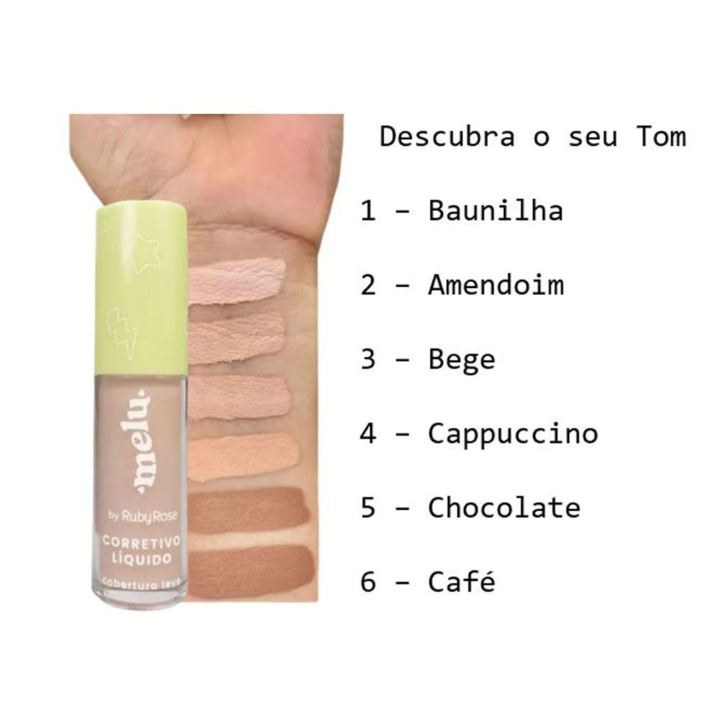 O Corretivo Melu cobertura leve da Ruby Rose é nosso novo queridinho!! Indicado para todos os tipos de pele, possui uma fórmula capaz de corrigir imperfeições, olheiras, marcas de expressão, espinhas e até cicatrizes. O corretivo possui um acabamento natural e longa duração podendo ser usado até mesmo como base. Não fique de fora leve o seu para casa. 6 cores: Baunilha 1 Amendoim 2 Bege 3 Capuccino 4 Chocolate 5 Café 6 Validade: 07/2028