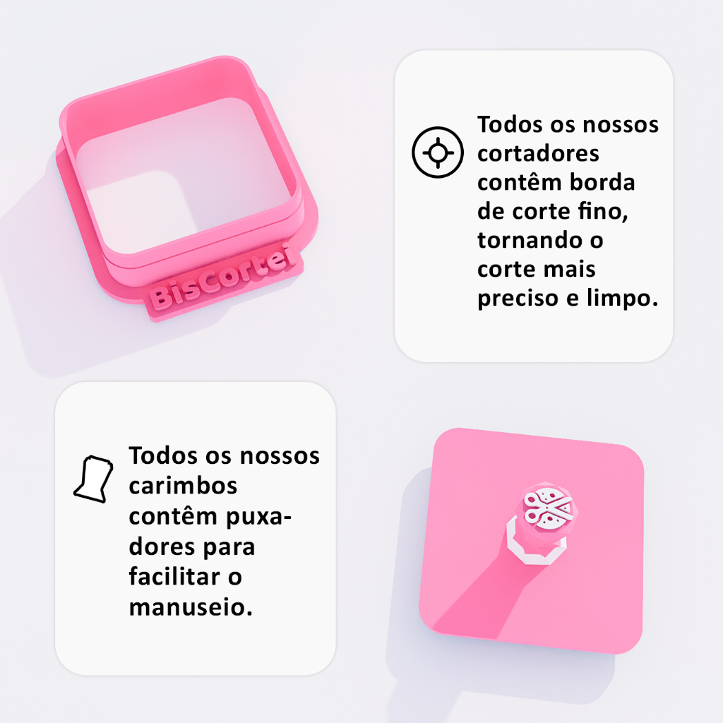 Tamanho: 7 cm (Lado Maior) Conteúdo: 01 Cortador + 01 Carimbo Todos os nossos carimbos contêm pegadores para facilitar o manuseio. Material: Nossos produtos são fabricados com PLA. Um plástico biodegradável, resistente e seguro para ter contato direto com alimentos. Utilização: Massa de Biscoito, Pasta Americana, Argila, Biscuit entre outros.