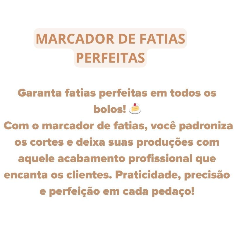 O Marcador Fatia Perfeita 11 Pedaços Caparroz é a ferramenta ideal para cortar bolos, tortas e sobremesas com praticidade e precisão. Com ele, cada fatia sai do mesmo tamanho, garantindo um visual uniforme e porções padronizadas — perfeito para vendas, eventos ou festas. Simples de usar, basta posicionar o marcador sobre o bolo para definir os cortes antes de servir ou fatiar. Fabricado em material resistente e de fácil limpeza, é indicado para uso doméstico ou profissional.