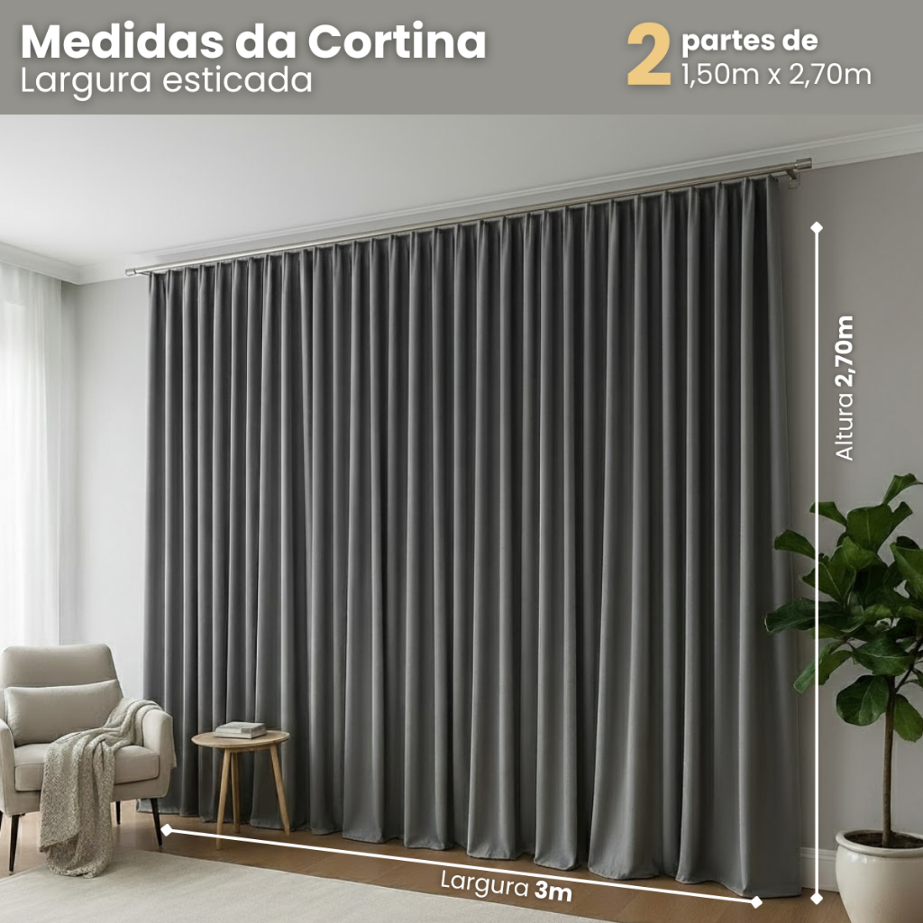 Cortina Blackout Eclipse para Trilho Suiço 3 metros de Largura Garanta conforto, privacidade e proteção solar com nossa cortina 80% blackout em tecido, desenvolvida especialmente para trilho suíço. Ideal para quem busca praticidade com um visual elegante e funcional. Modelo para trilho suíço – com passadores prontos para deslizantes. _______________________________________________________________________________________________________________ 📦Conteúdo da Embalagem: 01 Cortina Blackout com medida total de 3,00m de largura (CORTINA ESTICADA) Dividida em 2 partes de 1,50m x altura (NÃO ACOMPANHA O TRILHO) 📏 Alturas disponíveis: 2,30m | 2,50m | 2,60m | 2,70m ________________________________________________________________________________________________________________ 📌Detalhes do Produto: - Tecnologia blackout que bloqueia até 80% da entrada de luz, proporcionando ambientes mais aconchegantes e preservando sua privacidade - Contribui para a economia de energia elétrica em ambientes climatizados, podendo reduzir o consumo em até 20% - Tecido 100% poliéster: leve, resistente, fácil de limpar e com tratamento antialérgico, perfeito para quem busca conforto e segurança - Deslizantes Max e Terminais ________________________________________________________________________________________________________________ ✔️ Principais Benefícios: - Bloqueia até 80% da luz: Ambiente mais aconchegante, ideal para quartos, salas e escritórios. - Conforto Térmico: Ajuda a regular a temperatura do ambiente. - Elegância e Caimento Impecável: Instalação em Trilho Suíço com deslizantes costurados, proporcionando um visual moderno e sofisticado. - Privacidade Total: Essencial para ambientes onde a privacidade é fundamental. ✅ Indicação: perfeita para salas, quartos e escritórios. 🎨 Cores Disponíveis: Bege, Branco Gelo, Chumbo, Cinza, Palha, Preto e Tabaco 🧼 Instruções de Uso: - Lavar à mão ou na máquina em velocidade leve - Usar sabão neutro - Secar à sombra. - Passar ferro em temperatura baixa. ❓Informações Gerais: - Material visual ilustrativo; - Pode haver alterações na tonalidade da cor da imagem do produto, devido a diferença de telas de visualização; - Fique atento(a) à descrição do produto, podendo não apresentar todas as peças que constam no material visual; - Garantia contra defeito de fábrica.
