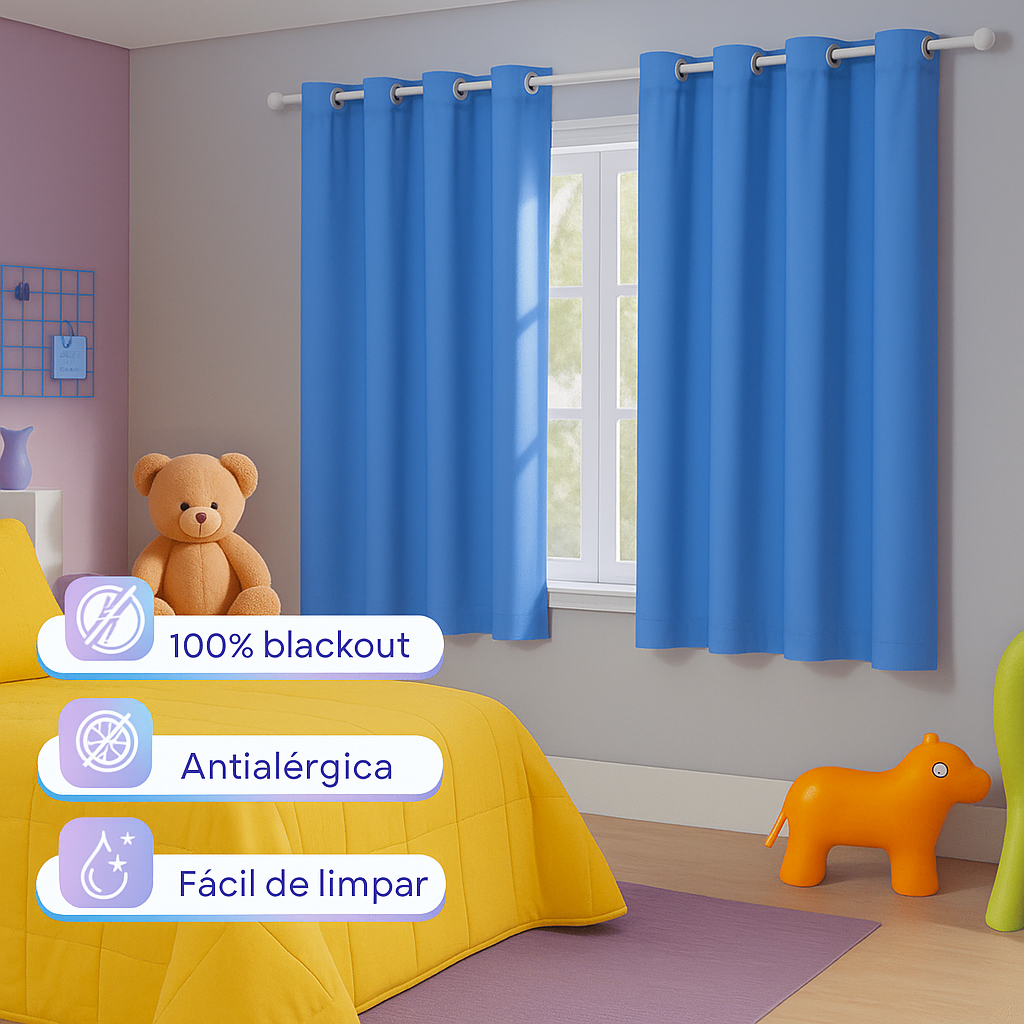 Cortina Blackout para Quarto Infantil – 2,20x1,30m Meninas e Meninos100% Bloqueio da Luz Essa cortina infantil blackout é perfeita para garantir conforto e tranquilidade no quarto das crianças. Ideal para quem deseja bloquear totalmente a luz solar durante o dia, ela proporciona um ambiente mais escuro, sendo ideal para um sono mais profundo ou para momentos de descanso e filmes. Além disso, ajuda a manter a temperatura do ambiente agradável mesmo nos dias mais quentes. Seu design versátil combina com quartos de meninos e meninas, trazendo funcionalidade e um toque de cor ao ambiente. Contém na Embalagem: 02 Cortinas Blackout medindo 1,10m x 1,30m cada Medidas Totais: 2,20m de largura x 1,30m de altura (uma cortina completa com 2 partes) Indicada para varão de até 1,50m (Varão não incluso) Composição: 100% Policloreto de Vinila (PVC) Instruções de Uso e Lavagem: Para retirar marcas de dobra, deixar esticada ao sol por 4 a 6 horas Limpeza com pano úmido e limpo Não utilizar alvejantes à base de cloro Não utilizar secadora Não passar ferro