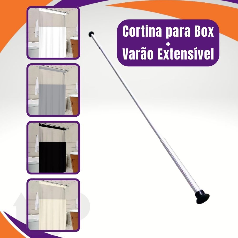 Cortina para box com visor e ganchos + Suporte Cortina Com a cortina para box em PVC você une praticidade e conforto. Com ela o seu banheiro não ficará mais todo molhado depois do seu banho. - 100% PVC - Tamanho 1,38x1,98cm - Material Resistente - Fácil de limpar - Antimofo Cores disponíveis: cinza, preto e bege. Escolha a cor no pedido. - Conteúdo da embalagem: * 1 Cortina Com Visor * Ganchos para instalação Varão Cortina Inox (com pontas brancas) Medidas aproximadas: 70cm - 120cm 110cm - 200cm 140cm - 260cm Varão Cortina Alumínio (com pontas pretas) Medidas aproximadas: 0,50cm x 0,90cm 0,90cm x 1,30m 1,15m x 1,50m