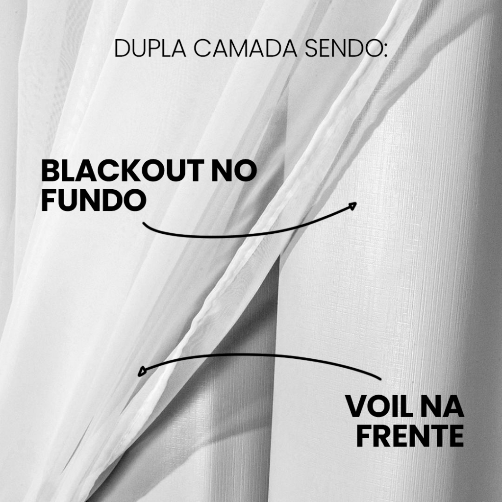 Cortina Blackout Corta Luz Com Voil Composição do produto: Forro 100% Policloreto de Vinila (PVC) Tecido superior em Voal 100% Poliéster Acabamento feito na bainha O produto é confeccionado em PVC, sendo um tipo de plástico especialmente feito para confecção de cortinas, possuindo uma textura na parte frente que imita tecido. A parte de trás do PVC é da cor cinza, sendo a parte cinza responsável por vedar 100 % a luz, com isso ajuda na preservação de pisos e móveis do envelhecimento que o sol causa, além de também ser muito eficiente no controle da temperatura. Conteúdo da embalagem: 01 Cortina Blackout 3,00M de largura x 1,80M de altura Cortina dividida em duas partes iguais(Varão não incluso) lhós: Desliza facilmente sobre o varão Não oxida Não enferruja Sobre o produto: Sombreamento total de 100% Produto para varão simples Enviado em embalagem própria e segura para cortinas