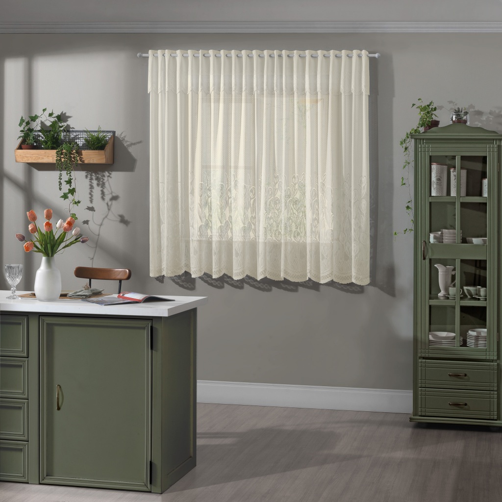Cortina de Cozinha Renda Tulipa 2,80m x 1,50m x 30cm Delicada Floral Trabalhada Clássica Decorativa
