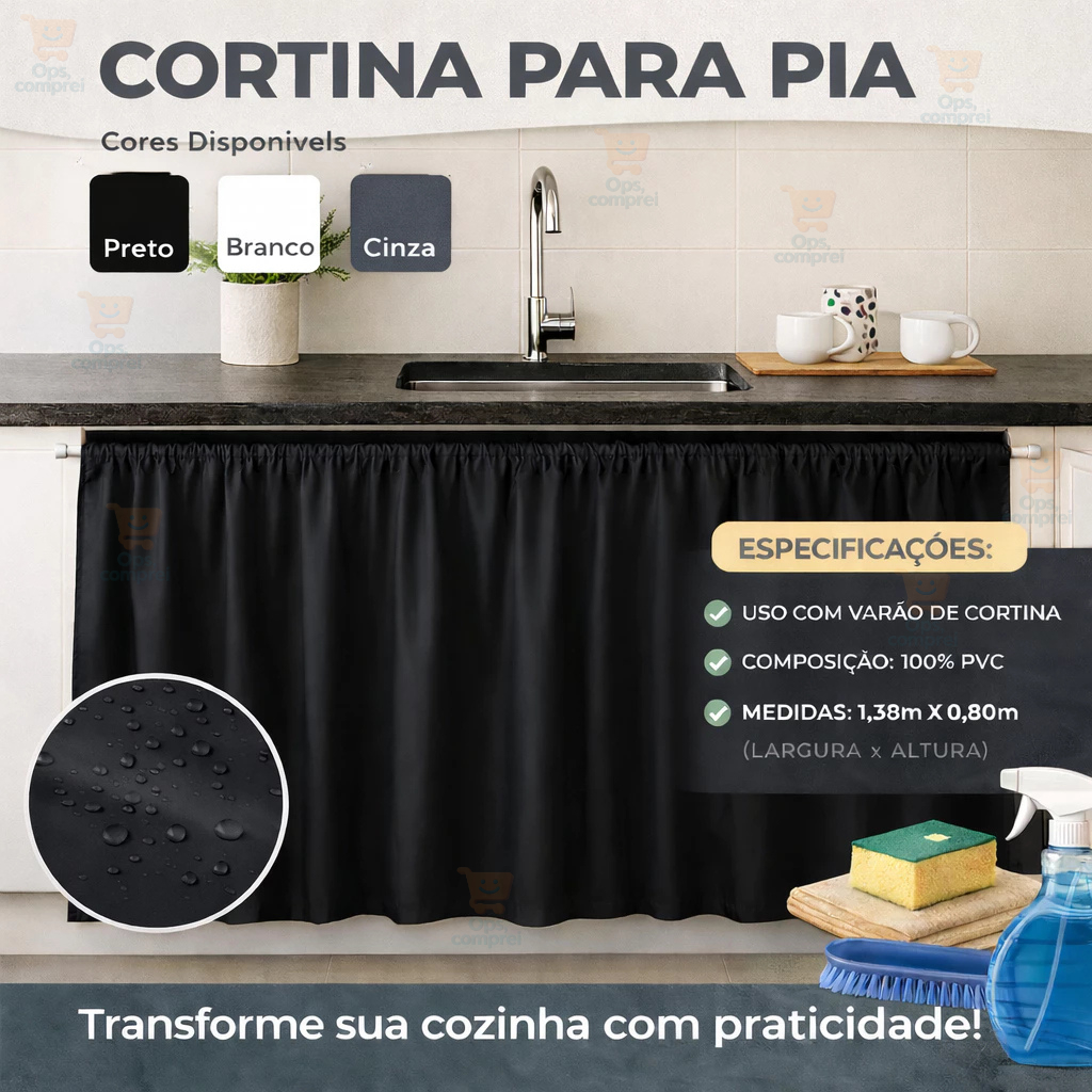 Cortina Para Pia Adicione um toque de praticidade e estilo à sua cozinha com nossa cortina para pia em PVC! Feita para durar e fácil de limpar, esta cortina possui medidas ideais de 1,38m x 0,80m para se ajustar perfeitamente ao seu espaço. Proteja sua pia enquanto eleva o visual do ambiente. Feita com materiais de alta qualidade, ela é resistente à água e fácil de limpar. Com um design moderno e discreto, combina perfeitamente com qualquer decoração e proporciona privacidade sem bloquear a luz natural. Além disso, é fácil de instalar e ajustar para garantir o tamanho perfeito para a sua pia. Adquira agora a nossa cortina de pia e tenha um espaço de cozinha ainda mais aconchegante e sofisticado VANTAGENS: * FÁCIL DE LIMPAR * EVITA QUE SEUS UTENSÍLIOS GUARDADOS ABAIXO DA PIA FIQUEM EXPOSTOS À POEIRA * DECORA SUA COZINHA ESPECIFICAÇÕES: * PARA USO COM VARÃO DE CORTINA * COMPOSIÇÃO: 100% PVC * MEDIDAS: 1,38m X 0,80m (LARGURA x ALTURA) Adquira já a sua!