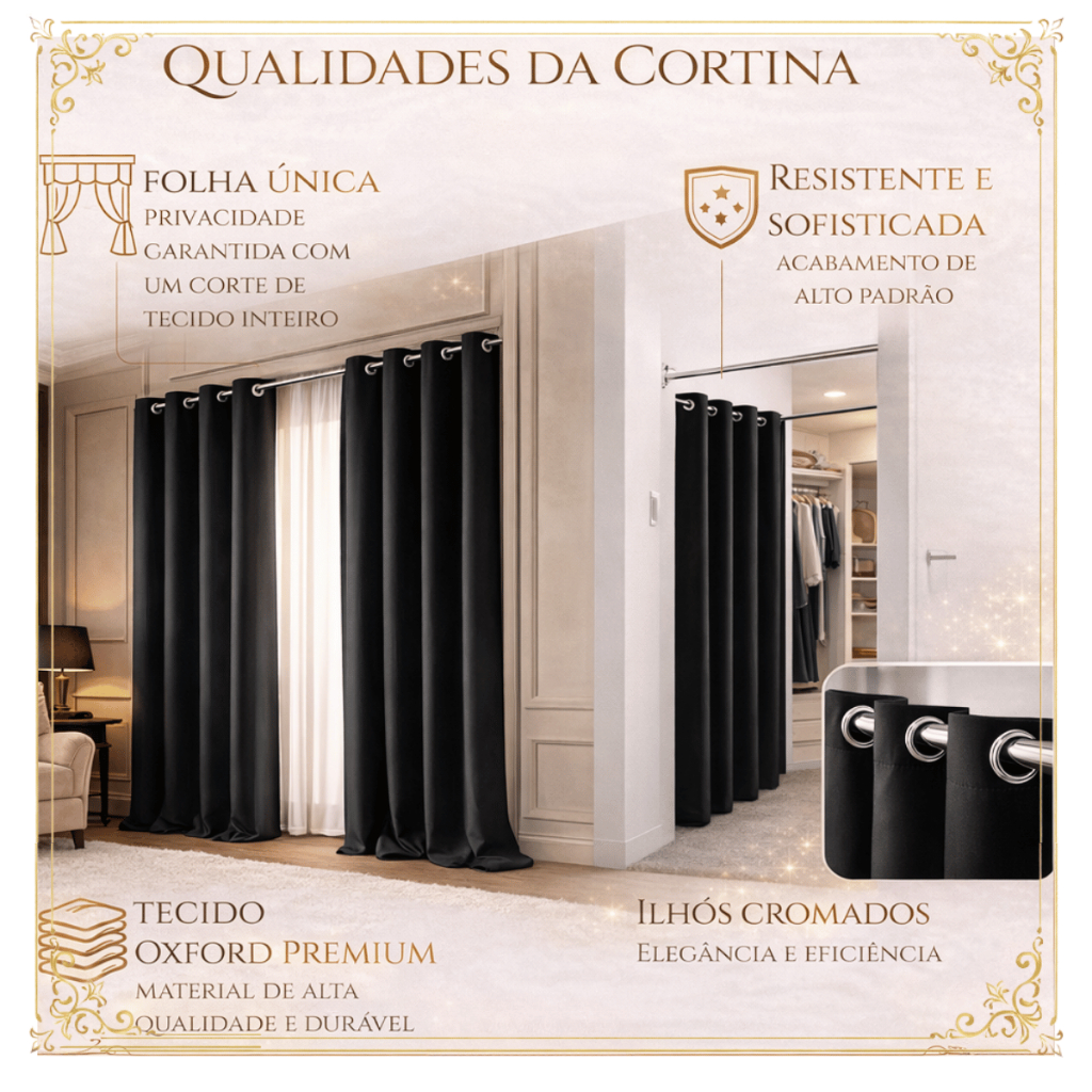 🖤 Cortina de Porta Supreme 1,30 x 2,20 m Blackout (Blecaute) – La Vie Enxovais Bloqueio total de luz, privacidade absoluta e acabamento sofisticado Transforme seus ambientes com mais conforto, privacidade e elegância. A Cortina de Porta Supreme La Vie Enxovais é confeccionada em tecido Blackout (Blecaute) Premium, totalmente opaco, proporcionando 100% de bloqueio da luminosidade, além de contribuir para o isolamento térmico e acústico do ambiente. Versátil e funcional, é ideal para salas, quartos, cozinhas, portas de entrada, corredores e provadores, unindo desempenho profissional e design elegante. ✨ Características do Produto Medidas: 1,30 m (largura) x 2,20 m (altura) Material: Tecido Blackout / Blecaute Premium reforçado Acabamento: Ilhós cromados de alta durabilidade Compatível com varões padrão Bloqueio total da luz: 100% opaco Conforto térmico: Auxilia na redução do calor Isolamento acústico: Ajuda a minimizar ruídos externos Cores elegantes e versáteis para diversos ambientes Fácil manutenção: Tecido resistente e prático de limpar ✅ Benefícios Privacidade total em qualquer ambiente Escurecimento completo do espaço Visual mais aconchegante e sofisticado Ideal para uso residencial ou comercial Instalação rápida e prática com ilhós cromados 👉 Dica: Para portas maiores, utilize duas cortinas lado a lado, garantindo melhor cobertura, caimento perfeito e um visual ainda mais sofisticado. ✨ La Vie Enxovais – qualidade, conforto e elegância para o seu lar ou negócio. Invista em um produto durável, funcional e com acabamento de alto padrão. Garanta já a sua Cortina de Porta Supreme Blackout.