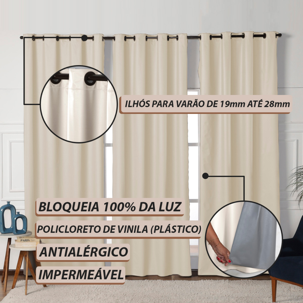!!!Atenção!!! O material da cortina é Policloreto de Vinila (Plástico), "Não" é confeccionada em tecido!!! Cortina Corta Luz / Blackout de PVC Contem: 01 Cortina Blackout 4,20m x 2,40m com 24 ilhóses Sendo: 03 partes de 1,40m x 2,40m (Larg x Alt) - 8 ilhóses cada parte Indicado para Varão Simples de 3,00m (venda separadamente) Produto antialérgico, impermeável, não passa claridade nenhuma, fácil limpeza, economiza até 20% de energia em ambientes com ar condicionado. Composição: 100% Policloreto de Vinila (Plástico) As fotos são meramente ilustrativas, as cores podem variar de acordo com cada monitor e não representam todas as peças que compõem a descrição do produto.