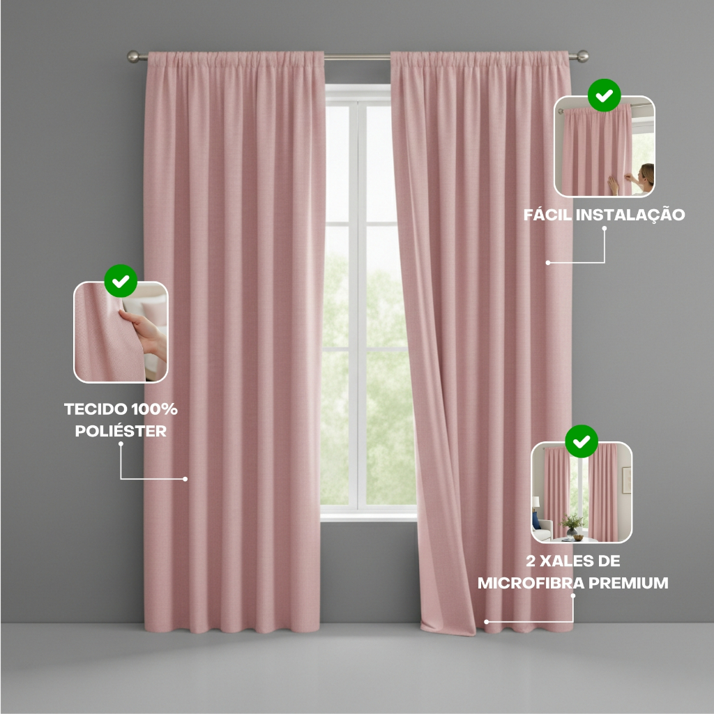 🪟 Cortina Clássica Xales Duplos – 2,40m x 3,00m - Elegância e Aconchego para o Ambiente Transforme o ambiente com a Cortina Clássica Xales Duplos, ideal para quem busca um visual clean, elegante e aconchegante. Seu design atemporal combina facilmente com diferentes estilos de decoração, trazendo mais conforto e harmonia ao espaço. Além de ajudar no controle da luminosidade, ela valoriza o ambiente com um caimento leve e sofisticado. Disponível em cores suaves e modernas - Perfeita para quartos, salas, escritórios ou ambientes infantis, adaptando-se facilmente à decoração. Destaques do Produto - 2 Xales de Microfibra Premium Tecido leve, macio e com ótimo caimento. - Visual Clean e Versátil Sem laços ou acessórios, ideal para quem prefere uma decoração minimalista. - Ideal para Varão Simples Compatível com varões de até 2 metros. - Fácil Instalação Sistema de passante prático para colocar e retirar com facilidade. - Tecido 100% Poliéster Resistente, fácil de lavar e com secagem rápida. O que você recebe - 2 Xales de cortina - Medidas de cada xale: 2,40m (altura) x 1,50m (largura) - Largura total aberta: 3,00 metros Cuidados com o Produto - Lavar à mão ou na máquina em modo delicado - Utilizar sabão neutro - Não utilizar alvejantes - Secar à sombra para maior durabilidade Garanta já a sua cortina e deixe seu ambiente mais bonito, aconchegante e elegante!