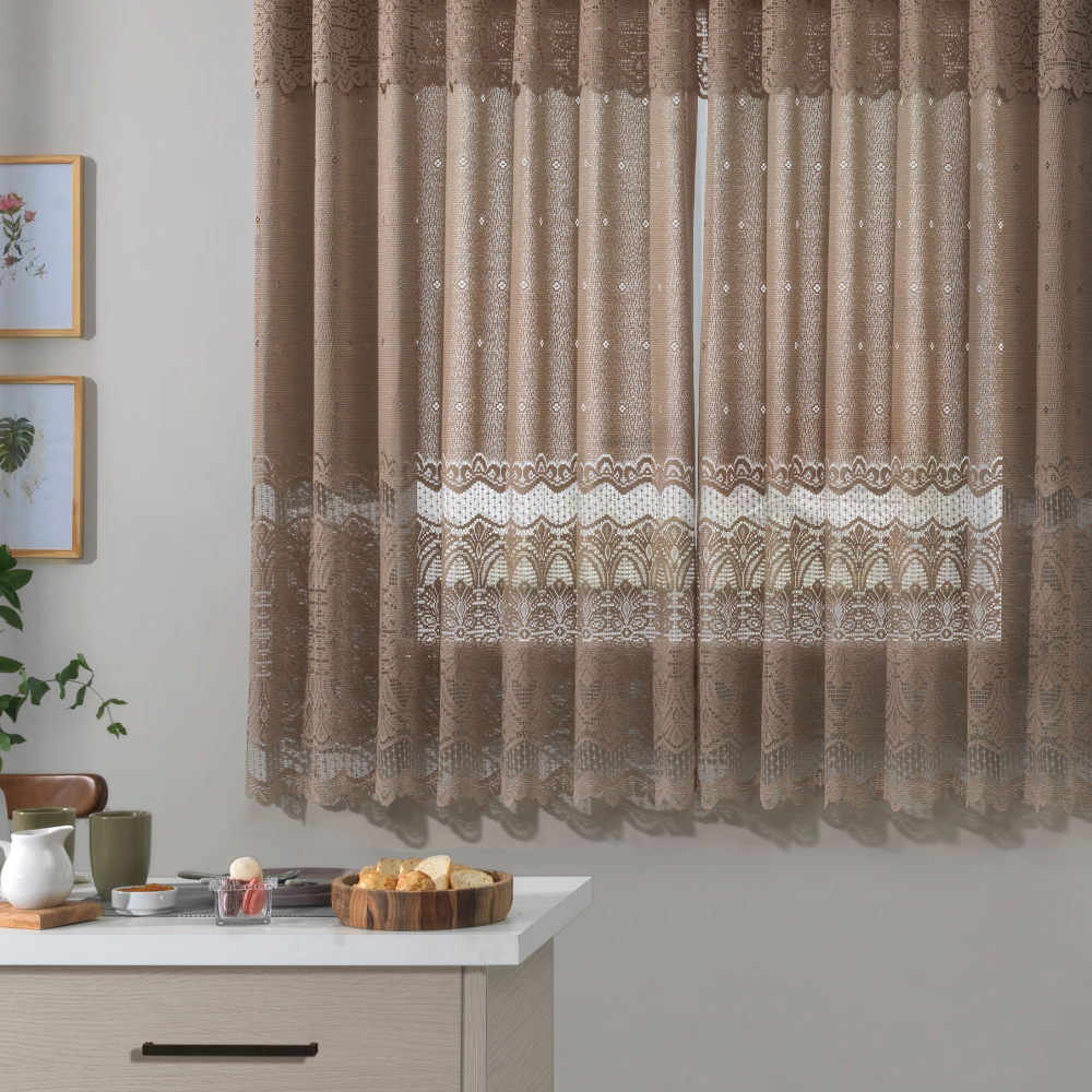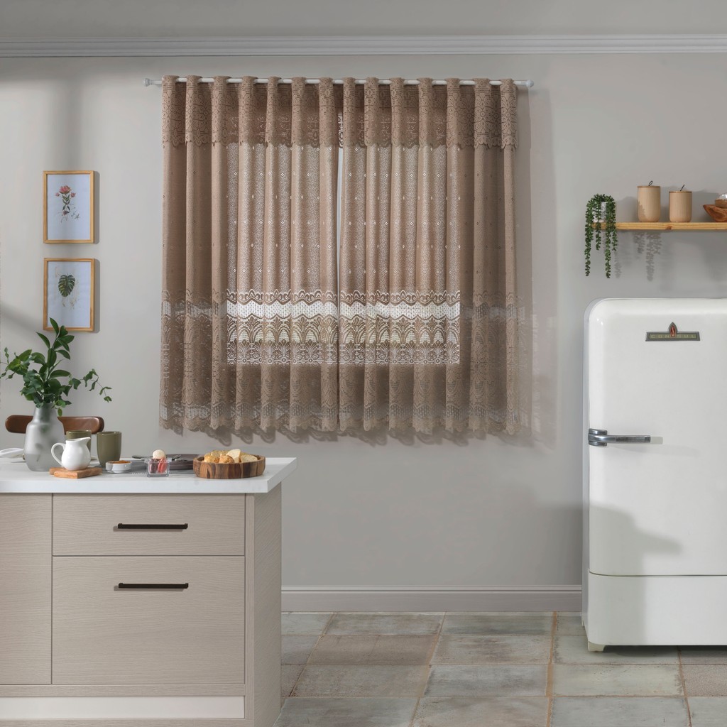 Cortina Renda Cozinha Arabesco Geométrica Lisa 2,20m x 1,20m Marrom Clássica Elegante Casa Decorada Nude luxo Requintada