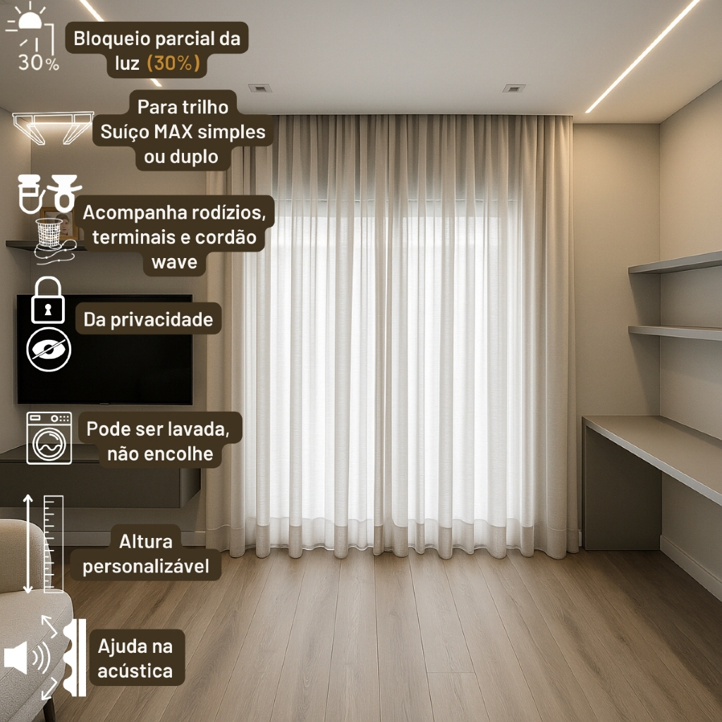 Cortina WAVE para Trilho Suíço Simples – Voil Gaze de Linho ou Flame com Forro em Microfibra Transforme seu ambiente com elegância e leveza! Essa cortina no modelo Wave foi desenvolvida para quem busca um visual sofisticado e moderno. 📏 Dica importante sobre o tamanho: Para um caimento com ondas elegantes, a largura da cortina deve ser 3x o tamanho do trilho. Exemplo: Trilho de 2m → Cortina com 6m de largura. 🪟 Ideal para salas ou qualquer ambiente onde o foco seja decoração e privacidade leve. ⚠️ Atenção: Este modelo não bloqueia totalmente a luz (vedação de 30%). Para escurecimento total, confira nossa versão com blackout. ✅ Destaques do Produto: Modelo: WAVE para trilho suíço simples ou duplo (se for duplo informar no chat após a compra) (compatível com varão deslizante tipo suíço) Tecidos: • Voil Gaze de Linho também conhecido como Voil Flame • Forro em Microfibra leve Vedação: 30% de bloqueio da luz Cordão Wave incluso, para formar as ondas perfeitas Acompanha: Rodízios tipo Maxi e terminais para travamento nas extremidades. Altura personalizada Duas folhas de largura Composição: 100% Poliéster 🛠️ Outras informações: Compatível com trilho suíço ou varão deslizante Se você precisa para trilho duplo, avise no chat após a compra! Fazemos sob medida: consulte opções e valores pelo campo de perguntas Garantia do vendedor: 3 meses Envio imediato – Produto à pronta entrega