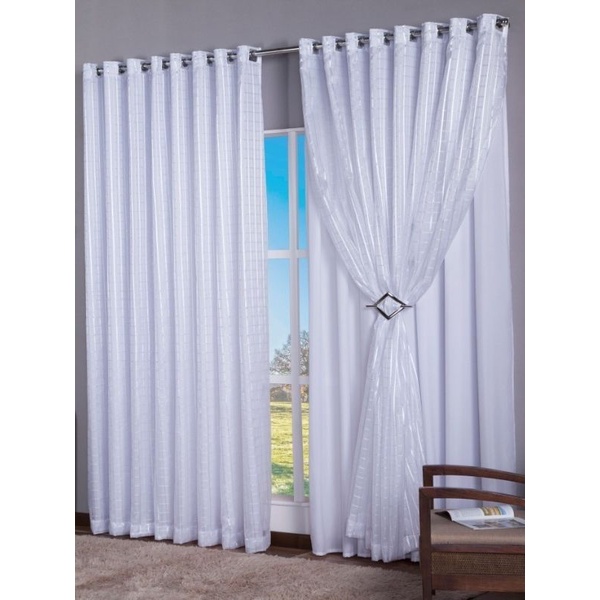 cortina microfibra com voil Medidas: 4,00 metros de largura 2,80 metros de altura sendo : dois lados de 2,00 metros x 2,80 metros Recomendado para varão de até 3,00 metros 100 % poliéster A cortina é confeccionada com alta qualidade da família Sampaio enxovais, tem acabamentos em bainha e em baixo no voil uma barra mais larga que deixa seu visual ainda mais bonito, ela não corta a luz ela deixa o ambiente clarinho leve e sofisticado porem tambem não da para ver do outro lado pois ela não é transparente, Qualquer duvida pode entrar em contato com nosso chat responderemos assim que possivel seje paciente um pouco pois é um pouco corrido mas temos a certeza que iremos te atender bem aguardamos você otimas compras.