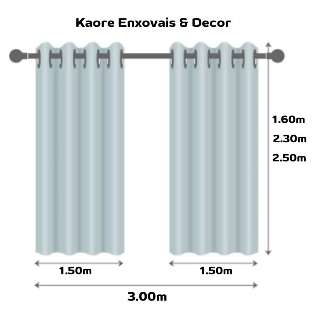 IMAGENS ILUSTRATIVAS, CONFIRA AS MEDIDAS ABAIXO Cortina de Voil Liso 3,00m e 2,00m de largura (esticada) x 1,40, 1,60, 2,30 e 2,50 m de comprimento. COMPOSIÇÃO: - 100% Poliéster; - Tecido Voil; - Acabamento refinado, toda em bainha e com ilhós redondo branco. BENEFÍCIOS: - Proporciona mais privacidade ao seu ambiente. - Melhora a iluminação do ambiente. - Deixa a casa mais aconchegante. - Conforto visual e térmico ao ambiente. - Protege contra poeira. - Protege contra insetos. - Protege contra fumaça, poluição e odores desagradáveis. - Cortina 100% ANTIALÉRGICA e ANTIÁCARO. - Costura reforçada. - Tripla costura com mais transparência no acabamento. - 16 Ilhós premium com ressalto na parte superior para melhor correr no varão. CARACTERÍSTICAS: - Não bloqueia a luz solar; - Ilhós branco na parte da frente e branco na parte de trás; - Embalagem de PVC com encarte ou etiqueta de composições e descrições de conteúdo; - Ilhós não corrói na maresia, por não ser de ferro; - Instruções de lavagem (etiqueta interna do produto). Recomendada para varão de 2,0m para que fique franzida; Varão simples (fino de 19mm ou grosso de 28mm); Não acompanha varão.