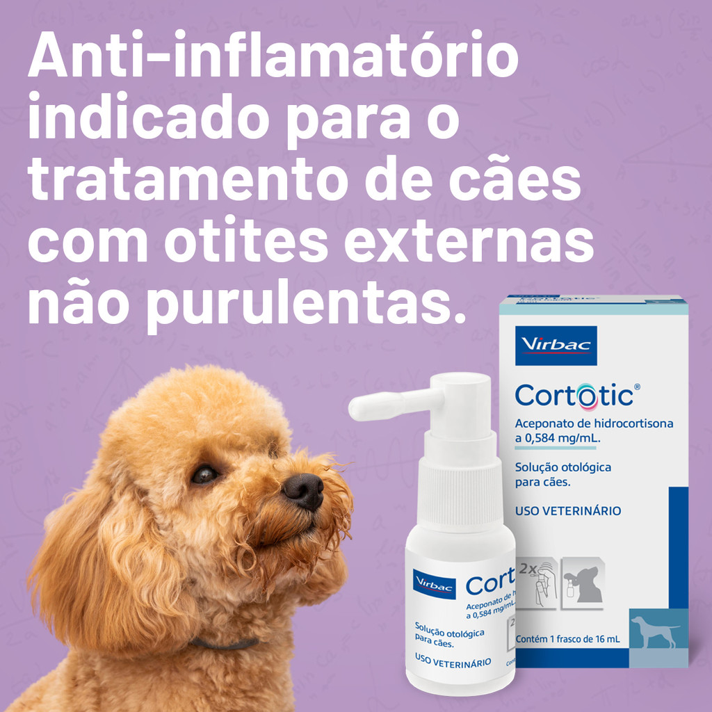 ____________________________________________________________________________ A nossa loja está a mais de 10 anos no mercado, com produtos originais e com nota fiscal. ____________________________________________________________________________ INDICAÇÃO: Indicado para o tratamento de cães acometidos por otites externas não purulentas. FÓRMULA: Para 1 ml: Aceponato de hidrocortisona........................................ 0,584 mg Excipiente q.s.p.......................................................................1 ml CORTOTIC - TRATAMENTO EFICAZ PARA OTITE EXTERNA NÃO PURULENTA EM CÃES A otite externa não purulenta em cães, muitas vezes, resulta de um desequilíbrio da microbiota natural das orelhas, levando a desconforto e inflamação. Para combater esses sintomas, o CORTOTIC é a solução ideal. Este medicamento foi clinicamente testado e comprovado na redução da inflamação no canal auditivo, evitando assim complicações como infecções secundárias oportunistas. MODO DE USO E POSOLOGIA: 1-PREPARAÇÃO: Remova a tampa do frasco e acople a válvula aplicadora. 2-APLICAÇÃO: Limpe o canal auditivo do animal antes da primeira aplicação. Mantenha o frasco na posição vertical, insira a cânula atraumática da válvula aplicadora no canal auditivo do cão e pressione a válvula para liberar duas borrifadas (0,44 ml por orelha) a cada 24 horas. DURAÇÃO DO TRATAMENTO: - TRATAMENTO RECOMENDADO: Aplicação durante 7 a 14 dias consecutivos, conforme a resposta clínica do animal. - ACOMPANHAMENTO: Se após os primeiros 7 dias a cura clínica não for confirmada, continue o tratamento até completar 14 dias, sempre sob a orientação do médico veterinário. Com o CORTOTIC, você garante o alívio e bem-estar do seu cão, prevenindo complicações futuras. ____________________________________________________________________________ ESPECIFICAÇÃO: Indicado para qual animal: Cão Indicado para quais raças: Todas as raças Indicado para que tamanho: Todos os tamanhos ____________________________________________________________________________ Gostou? Não perca tempo, garanta já o seu!