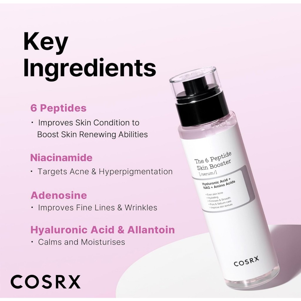 COSRX Sérum The 6 Peptide Skin Booster, 150ml / 5.07fl oz, Essência Facial Renovadora Da Pele Sérum de reforço de pele: Sérum de aumento de pele com 6 peptídeos que melhoram a elasticidade da pele, sérum de reforço de pele: sérum de aumento de pele com 6 peptídeos que melhoram a elasticidade da pele, linhas finas, poros e brilho. Aumente a condição da sua pele e obtenha vários benefícios com este soro. Com textura leve em forma de toner, o sérum é ótimo para usar como primeiro passo de cuidados com a pele: Com uma textura leve em forma de toner, o sérum é ótimo para usar como o primeiro passo da sua rotina diária de cuidados com a pele. - Ingredientes principais: 6 Peptídeos que aumentam a elasticidade da pele, reduzem a hiperpigmentação, controlam os poros, renovam a pele, acalmam e aliviam a pele e melhoram a aparência de linhas finas e manivelas. Modo de Usar: Após a limpeza, aplique 2-3 bombas do Sérum no rosto. Camada favorita em seu hidratante favorito para hidratação adicional. Sérum COSRX Niacinamida 15 OU a Vitamina COSRX Melhor quando usada com o Sérum COSRX Niacinamida 15 OU o Sérum COSRX Vitamina C 23/13. Padrões COSRX: Todos os produtos COSRX são formulados com ingredientes amigáveis à pele - Padrões COSRX: Todos os produtos COSRX são formulados com ingredientes amigáveis à pele que aliviam a pele irritada. Hipoalergênico, testado por dermatologistas, sem testes em animais, sem parabenos, sem sulfatos, sem ftalatos