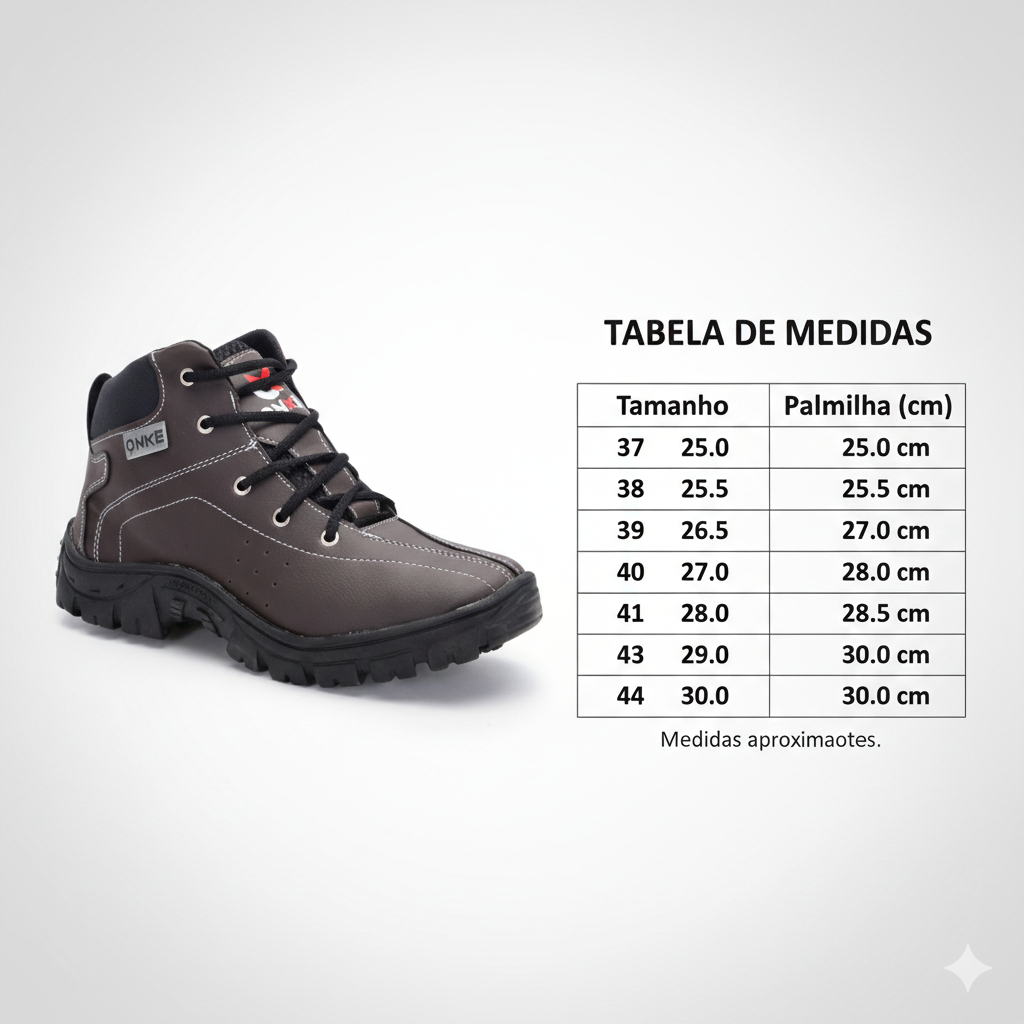 A Bota Adventure Onke é a escolha ideal para quem busca resistência e estilo em um único calçado. Projetada para encarar tanto o asfalto quanto terrenos irregulares, ela oferece o suporte necessário para suas aventuras diárias ou trilhas leves. Diferenciais do Produto: Design Robusto: Confeccionada em material sintético de alta qualidade na cor café, com acabamento em costuras contrastantes que reforçam a durabilidade. Conforto no Tornozelo: Possui cano médio com preenchimento espumado e forro em tecido respirável, garantindo conforto e evitando atritos durante o uso prolongado. Ajuste Preciso: Sistema de amarração com ilhoses metálicos e cadarços resistentes, permitindo um ajuste firme e seguro. Solado Tratorado: Solado de borracha antiderrapante com garras profundas, proporcionando excelente tração e estabilidade em diversos tipos de superfícies. TABELA DE MEDIDAS (Palmilha) 37 — 25,0 cm 38 — 25,5 cm 39 — 26,5 cm 40 — 27,0 cm 41 — 28,0 cm 42 — 28,5 cm 43 — 29,0 cm 44 — 30,0 cm Dica para o cliente: Para medir, basta colocar o pé sobre uma folha de papel, marcar o calcanhar e a ponta do dedão, e medir a distância com uma régua.