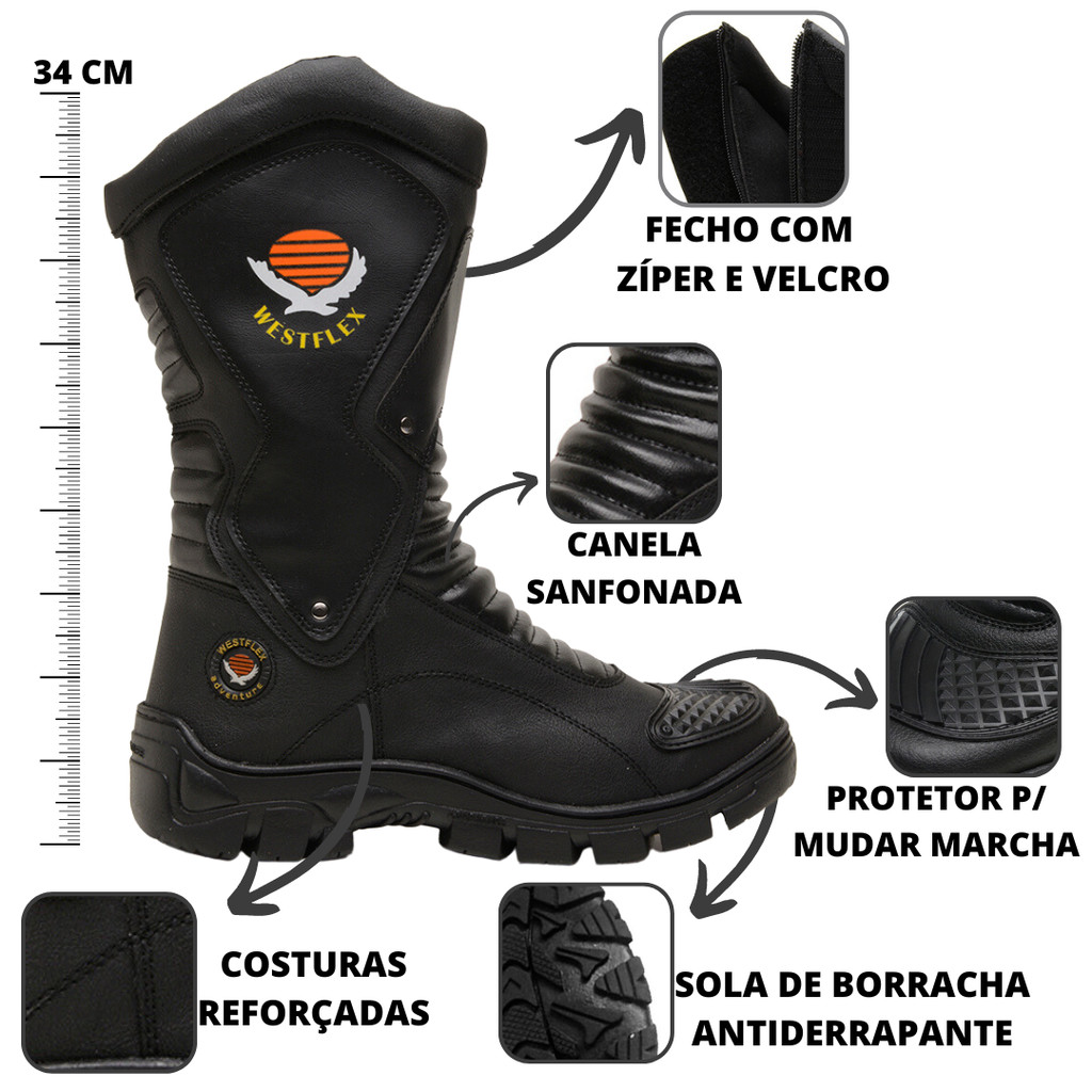 - Material: Sintético - Forro: Têxtil Macio Preto (Antibacteriano) - Palmilha: Eva com absorção de impacto - Solado: Borracha antiderrapante (Costurada) - Altura do Cano: 30 CM - Canela: Canela Sanfonada - Ajuste: Velcro e Zíper - Cores Disponíveis: Preto - Tamanhos: 37 ao 44 - Estilo: ADVENTURE / URBANO - Referências: 4080 - BICO: Proteção de pedal p/ mudar marcha - Fixação: Sola Colada e Costurada >>>>>>>ENVIAMOS EM 24 HORAS