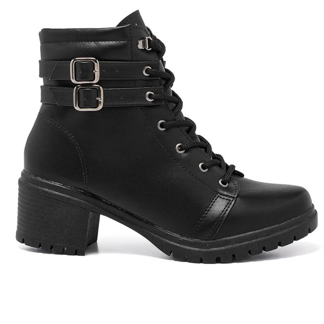 Coturno Feminina Salto Grosso Bota Tratorada Cano Curto Enfeite Dupla Fivela Inverno Moda Blogueira