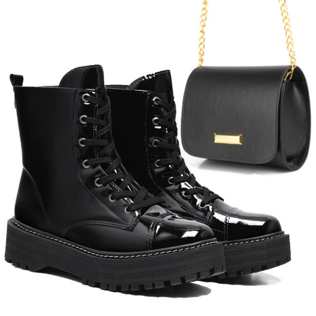 Medidas das Palmilhas: 33: 23,5 cm 34: 24,0 cm 35: 25,0 cm 36: 25,5 cm 37: 26,0 cm 38: 26,5 cm 39: 27,0 cm 40: 27,5 cm Altura do Cano: 19 cm Altura da Sola: 5 cm Altura Total: 24 cm Material: Verniz ou Napa (Couro Sintético) Sola: Emborrachado macio e antiderrapante Transforme seu visual com o nosso coturno, um modelo em alta entre as "Blogueirinhas"! Versátil e estiloso, ele adiciona um toque Fashionista a qualquer look, seja com calças, shorts, saias ou vestidos. Seu design moderno e qualidade incomparável garantem que você esteja sempre na moda. E o melhor: com um preço imperdível, só aqui você encontra essa combinação de estilo e custo-benefício! Bolsa Estilosa Adicione sofisticação ao seu dia a dia com nossa bolsa, que combina perfeitamente com o coturno. Feita em material de alta qualidade, é ideal para quem busca estilo e funcionalidade. Seu design prático e moderno se adapta a diversas ocasiões, do trabalho ao passeio, mantendo você sempre elegante. Complete seu look com esta peça indispensável!