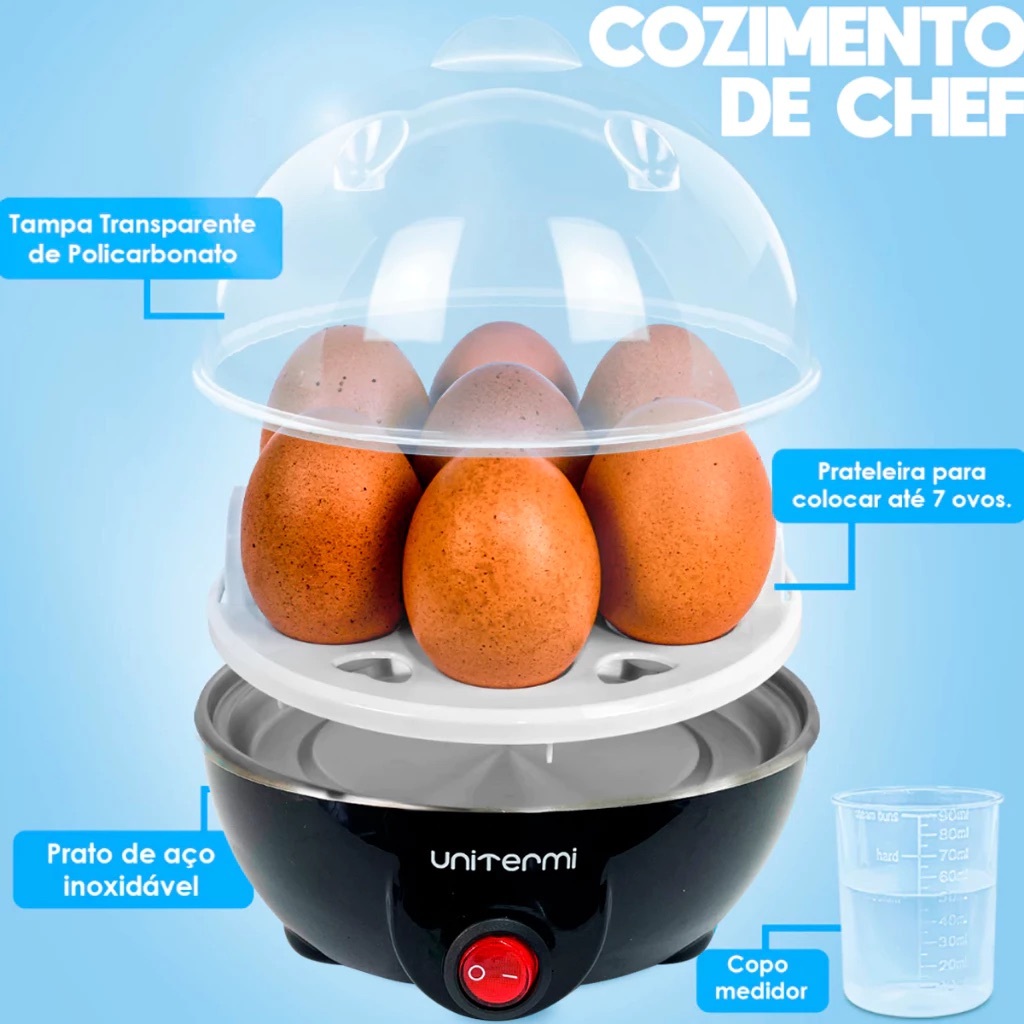 Cozedor De Ovos Elétrico Unitermi O Cozedor de Ovos da Unitermi é ideal para quem busca mais praticidade na hora de preparar suas refeições. Com capacidade para cozinhar até 7 ovos por vez, você prepara ovos perfeitos em minutos, com a praticidade de selecionar o ponto ideal de cozimento, sem bagunça e com total controle. Características: > Cozimento rápido; > Design elegante e moderno; > Possui indicador com luz de prontidão; > Tampa transparente para monitoramento; > Ocupa pouco espaço na cozinha e é fácil de guardar; > Capacidade para cozinhar até sete ovos por vez, no ponto que desejar. Especificações Técnicas: > Material: aço inoxidável e plástico injetado; > Dimensões do produto (C x L x A): 16,5cm x 16cm x 16cm. > Modelo: 127V | Potência: 350W | Tensão: 127V | Frequência: 50~60 Hz | Corrente: 3.0 A; > Modelo: 220V | Potência: 350W | Tensão: 220V | Frequência: 50~60 Hz | Corrente: 1.5 A. - Marca: Unitermi - Garantia: 12 meses contra defeitos de fabricação Vantagens de comprar na Brester: - Produto a pronta entrega. - Produto novo, com garantia de fábrica. - Nota fiscal para Pessoa Física e Pessoa Jurídica.