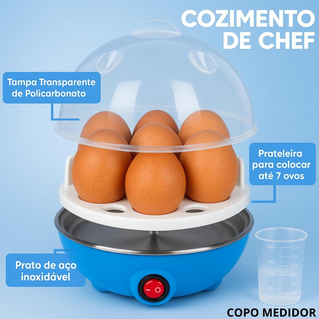!!!!ATENÇÃO: NÃO É POSSÍVEL ESCOLHER A COR enviaremos conforme disponibilidade!!!!!!!!!ATENÇÃO O PRODUTO É SOMENTE 220V-240V !!!!!!Cozedor De Ovos p/ até 7 OvosO Cozedor de Ovos Portátil 220V é ideal para quem mantém uma vida corrida e gosta de otimizar tempo e manter uma alimentação saudável.Prático, basta acrescentar um pouco de água e você poderá cozinhar até 7 ovos em poucos minutos.É um produto pequeno, prático, que pode ser levado para qualquer lugar e preparar receitas deliciosas. É também excelente para presentear quem você gosta, encantando pela beleza e praticidade do produto.INDICADO PARA:Ovos de galinha, ovos de codorna, vegetais e legumes.INSTRUÇÕES DE USO:Coloque a quantidade de água para atingir o ponto do ovo que deseja.Despeje a água na base de cozimento e coloque o suporte para ovos.Coloque os ovos, ligue o aparelho e coloque a tampa (Nunca cubra a tampa com qualquer pano ou objeto).A luz do botão Liga/desliga apaga ao finalizar o cozimento!!!!Quantidade de Água E Tempo Aproximado!!!!Seja 1 ovo ou 7 ovos, não tem problema a quantidade de ovos, o importante é a exata quantidade de água.* Ovo GEMA MOLE = 50ml de água, vai desligar sozinho, desligue o plug e tire da tomada.* Ovo GEMA MÉDIA = 70ml de água vai desligar sozinho, desligue o plug e tire da tomada.* Ovo cozido GEMA DURA = 90ml de água, vai desligar sozinho, desligue o plug e tire da tomada.RECOMENDAÇÕES DE SEGURANÇA:Ao retirar a tampa, cuidado com o vapor o mesmo pode causar queimadura.A base de cozimento fica muito quente. Cuidado ao retirar os ovos;Nunca mergulhe o corpo do cozedor de ovos na água.Desligue o botão liga/desliga ao fim do processo.Dimensões: 15x15,5cmPeso: 0,325kgPaís de Origem: ChinaTipo de Garantia: Sem GarantiaQuantidade:1!!!!ATENÇÃO: NÃO É POSSÍVEL ESCOLHER A COR enviaremos conforme disponibilidade!!!!