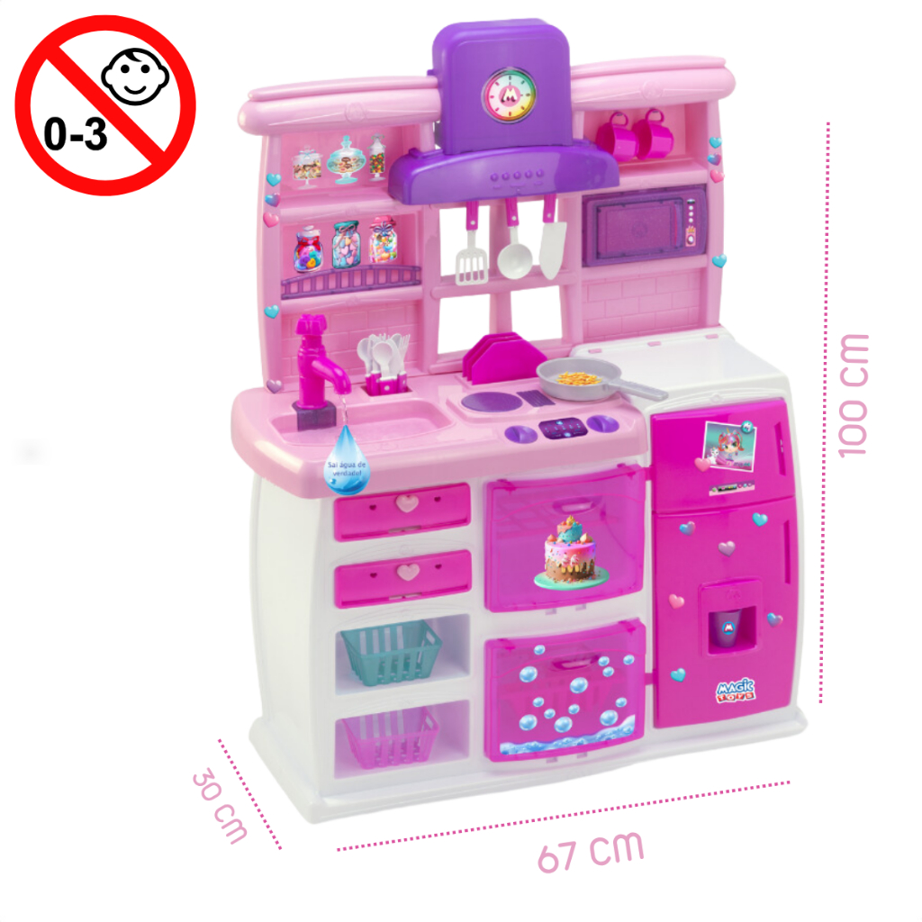 Este anúncio contem: 1 cozinha completa com 26 acessórios. Principais dúvidas: Possui som? Não. Possui Luz? Não. A torneira sai água de verdade? Sim. Qual é a sua altura? 100 cm. Portas abrem e fecham? Sim. Para em pé sozinha? Sim. Acompanha os acessórios? Sim: 03 pires, 03 xícaras, 03 colheres, 03 garfos, 03 facas, 01 espumadeira, 01 faca, 01 concha, 02 escorredores de prato, 02 cestinhas quadradas, 01 forma de coração, 01 forma sextavada, 01 panela e 1 copo. A Cozinha Master da Magic Toys com 26 acessórios oferece uma experiência completa e divertida para as crianças. Possui nichos para organizar as cestinhas e um forninho com grelha. A pia tem uma torneira que realmente solta água, proporcionando mais realismo nas brincadeiras. A geladeira conta com prateleiras e o micro-ondas tem uma porta que abre e fecha. Além disso, o lava-louças vem com escorredor e as gavetas possuem porta-talheres, enquanto o dispenser de água torna a brincadeira ainda mais interativa. Informações: Idade mínima recomendada: +3 anos. Altura da cozinha: 100cm. Largura da cozinha: 30cm. Comprimento da cozinha: 67cm. Composição/Material: Plástico. Certificação: CE-BRI/IQB 54818/21-025. Fabricante: Magic Toys. - Produto novo e em estoque; - As cores/tonalidade do produto ou acessórios podem variar de acordo com o lote de fabricação; - Todos os produtos têm seguro contra extravio.