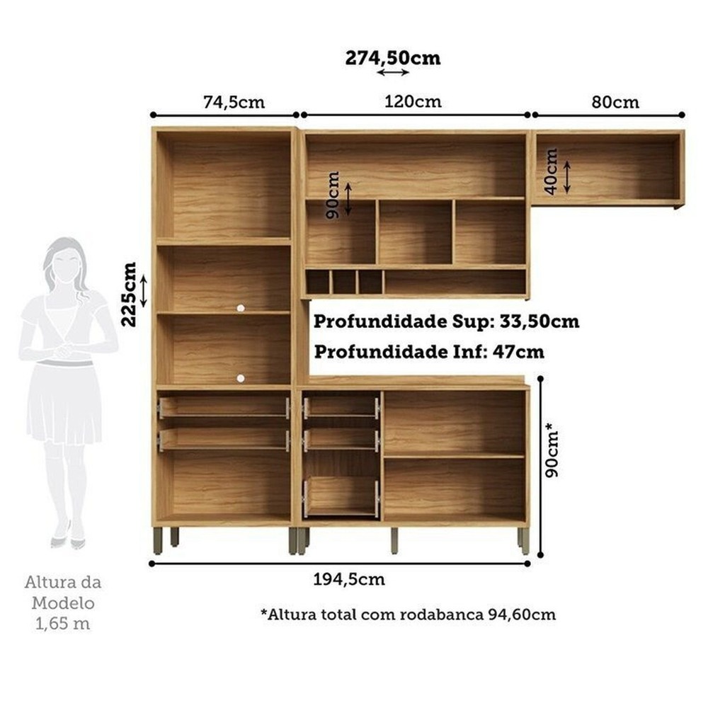 Cozinha Compacta 100% Mdf 4 Peças 7 Portas 5 Gavetas e Vidro 274cm Vicenza Espresso Móveis Amêndoa/Branco