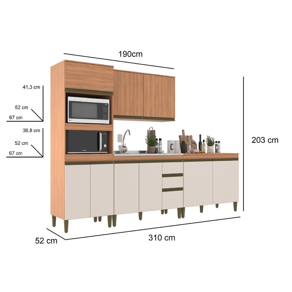 Cozinha modulada Cecília 4 Peças com 3 metro e 10 centímetros, todo produto é em chapa MDP 15mm, balcão 120 cm com 3 gavetas corrediças e dobradiças metálicas, Balcão com tampo 120 cm com 2 portas de bater, Aéreo 120 cm em MDP puxadores em perfil na cor bronze, Torre quente 70 X203 com espaço para forno e micro pés com altura de 17 cm com sapatilhas niveladoras, com espaço para Forno e Micro, produto com ótima qualidade em custo benefício. Estilo: Moderno Modular: Sim Peso (kg): 145.6 Garantia: 03 Meses Altura (cm): 203 Acabamento: Finish Foil Largura (cm): 310 Possui Pés: Sim Possui Vidro: Não Possui Portas: Sim Altura dos Pés: 17 Pés Reguláveis: Sim Possui Gavetas: Sim Possui Rodízio: Não Suporta Até (kg): 135 Acompanha Tampo: Sim Profundidade (cm): 52 Escala de Brilho: Fosco Gaveta com Chave: Não Material dos Pés: Polipropileno Textura da Porta: Lisa Material da Porta: MDP Material do Fundo: T-HDF Material do Tampo: MDP Origem do Produto: Nacional Acabamento dos Pés: Polipropileno Ambiente Principal: Cozinha Balcão Suporta Pia: Sim Espessura do Tampo (mm): 15 Material da Gaveta: MDP Material Principal: MDP Possui Prateleiras: Sim Acabamento da Porta: Finish Foil Quantidade de Peças: 4 Acabamento da Gaveta: Finish Foil Balcão Acompanha Pia: Não Material da Corrediça: Metálica Material da Prateleira: MDP Peso Máximo por Gaveta: 7 Acabamento da Prateleira: Finish Foil Tipo de Puxador da Porta: Externo Escala de Brilho da Porta: Fosco Tipo de Puxador da Gaveta: Externo Escala de Brilho da Gaveta: Fosco Peso Máximo por Prateleira: 20 Tipo de Armário de Cozinha: Cozinha Compacta Acompanha Rodapé Decorativo: Não Possui Recorte para Cooktop: Não Tipo de Corrediça da Gaveta: Metálica Simples Material do Puxador da Porta: Plástico Material do Puxador da Gaveta: Plástico Escala de Brilho da Prateleira: Fosco Medida de Cada Item (A x L x P) (novo): Balcão de pia : A 87 x C 120x P 52 - Balcão : A 87 x C 120x P 52 - Aéreo: A 69,5 x C 120 x P 32 cm - Torre: A 203 x C 70 x P 52 Material da Dobradiça/Corrediça da Porta: Metálica Marca: j carvalho Cor Flex: Não Cor Interna: Freijó Cor: Off White/Freijó Cor do Produto: Freijó/Off White Itens Inclusos: 1 Cozinha, Kit Ferragens e manual de montagem Cor Predominante: Marrom Linha ou Coleção: Cecília - J Carvalho Quantidade de Prateleiras: 05 Prateleiras Quantidade de Portas: 9 Portas Tamanho Indicado da Pia (L x C): 123x53 Quantidade de Gavetas: 03 Gavetas Quantidade do Produto: 1 Tamanho Indicado do Tampo (L x P): 120X53