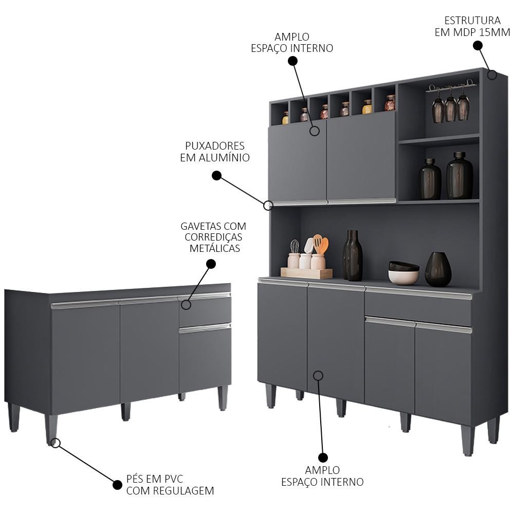 Cozinha Compacta Alice e Balcão Gabinete Sem Tampo Tatiane 120cm Cinza - AJL Móveis