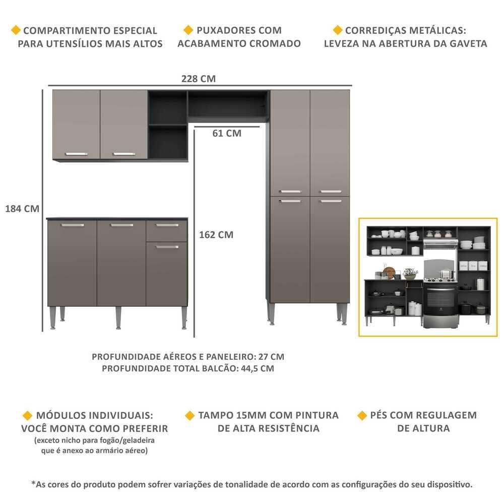 A Cozinha Compacta Pequim Up com Balcão Multimóveis tem um excelente custo benefício e um amplo espaço interno. Os módulos são individuais (exceto o nicho para fogão/geladeira que é anexo ao armário aéreo) e você pode montar da maneira que se adaptar melhor ao seu ambiente. Produzida em MDP com acabamento acetinado (cerca de 20% de brilho), que garante maior durabilidade e resistência, possui corrediças metálicas (mais leveza no manuseio), pés com regulagem de altura (permitem um perfeito nivelamento dos módulos), puxadores em ABS com acabamento cromado e tampos em MDP 15mm com pintura de alta resistência. O balcão possui tampo removível (compatível apenas com pia sob medida). Para deixar sua cozinha mais bonita e organizada, possui compartimento especial para utensílios mais altos e módulo aéreo com nichos. Conteúdo da Embalagem: 1 (um) Armário aéreo com nicho lateral e horizontal de 166cm 1 (um) Paneleiro duplo de 62cm 1 (um) Balcão com tampo de 105cm Kit Ferragem Manual de Montagem Dimensões do produto montado: Cozinha: Altura: 184cm | Largura: 228cm | Profundidade: 27cm (aéreos e paneleiro) - 44,5cm (balcão com tampo) Espaço do nicho para fogão/geladeira: Altura: 162cm | Largura: 61cm *Você pode consultar as medidas internas na imagem técnica do produto. *As cores do produto podem sofrer variações de tonalidade de acordo com as configurações do seu dispositivo. Imagem meramente ilustrativa. Decoração e eletros não acompanham o produto. O produto será entregue desmontado e não disponibilizamos o serviço de montagem.