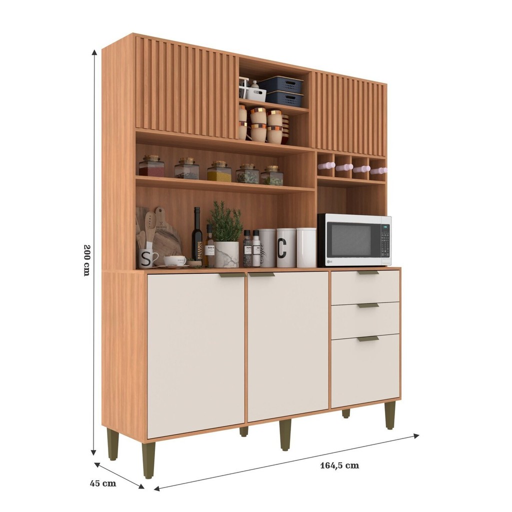 O Kit Cozinha Melissa J Carvalho móveis é o móvel perfeito para vc ter na sua cozinha ou até mesmo em outro ambiente que vc desejar para organizar seu espaço. Ela é um Kit Moderno e funcional, oferece um amplo espaço para organizar e deixar o seu dia a dia ainda mais prático inclusive contém espaço para armazenar seu vinho ou espumante. Composta por 5 portas sendo duas delas com um belo ripado. Com 2 gavetas e trilho telescópico. Estilo: Moderno Modular: Não Peso (kg): 95 Garantia: 03 Meses Altura (cm): 200 Acabamento: Finish Foil Largura (cm): 164.5 Possui Pés: Sim Possui Vidro: Não Possui Portas: Sim Tipo de Porta: Bater Altura dos Pés: 17 Pés Reguláveis: Sim Possui Gavetas: Sim Possui Rodízio: Não Suporta Até (kg): 70 Acompanha Tampo: Sim Profundidade (cm): 45 Tipo de Puxador: Alumínio Escala de Brilho: Fosco Gaveta com Chave: Não Material dos Pés: Polipropileno Material da Porta: MDP Material do Fundo: T-HDF Material do Tampo: MDP Origem do Produto: Nacional Acabamento dos Pés: Polipropileno Ambiente Principal: Cozinha Balcão Suporta Pia: Não Espessura do Tampo (mm): 15 Material da Gaveta: MDP Material Principal: MDP Possui Prateleiras: Sim Acabamento da Porta: Finish Foil Quantidade de Peças: 1 Sapatas Niveladoras: Sim Acabamento da Gaveta: Finish Foil Balcão Acompanha Pia: Não Material da Corrediça: Metálica Material da Prateleira: MDP Peso Máximo por Gaveta: 7 Acabamento da Prateleira: Finish Foil Tipo de Puxador da Porta: Externo Escala de Brilho da Porta: Fosco Espessura da Estrutura (mm): 15 Tipo de Puxador da Gaveta: Externo Escala de Brilho da Gaveta: Fosco Peso Máximo por Prateleira: 7 Tipo de Armário de Cozinha: Cozinha Compacta Possui Recorte para Cooktop: Não Tipo de Corrediça da Gaveta: Metálica Telescópica Material do Puxador da Porta: Alumínio Material do Puxador da Gaveta: Alumínio Escala de Brilho da Prateleira: Fosco Material da Dobradiça/Corrediça da Porta: Metálica Marca: j carvalho Cor Flex: Não Cor Interna: Freijó Cor do Produto: Freijó/Off White Itens Inclusos: 1 Cozinha completa kit ferragem e manual QR Code impresso na embalagem e no kit ferragem de cada item Cor Predominante: Marrom Linha ou Coleção: 2025 Quantidade de Prateleiras: 03 Prateleiras Quantidade de Portas: 5 Portas Tamanho Indicado da Pia (L x C): Não Possui Quantidade de Gavetas: 02 Gavetas Quantidade do Produto: 1