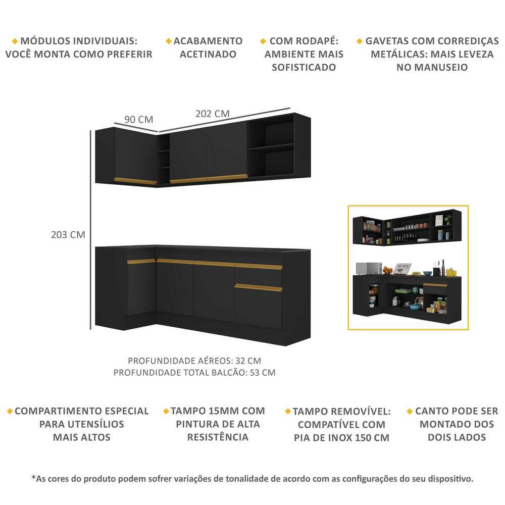 Cozinha Compacta de Canto com Rodapé Veneza Multimóveis MP2093 com Armário e Balcão Preta