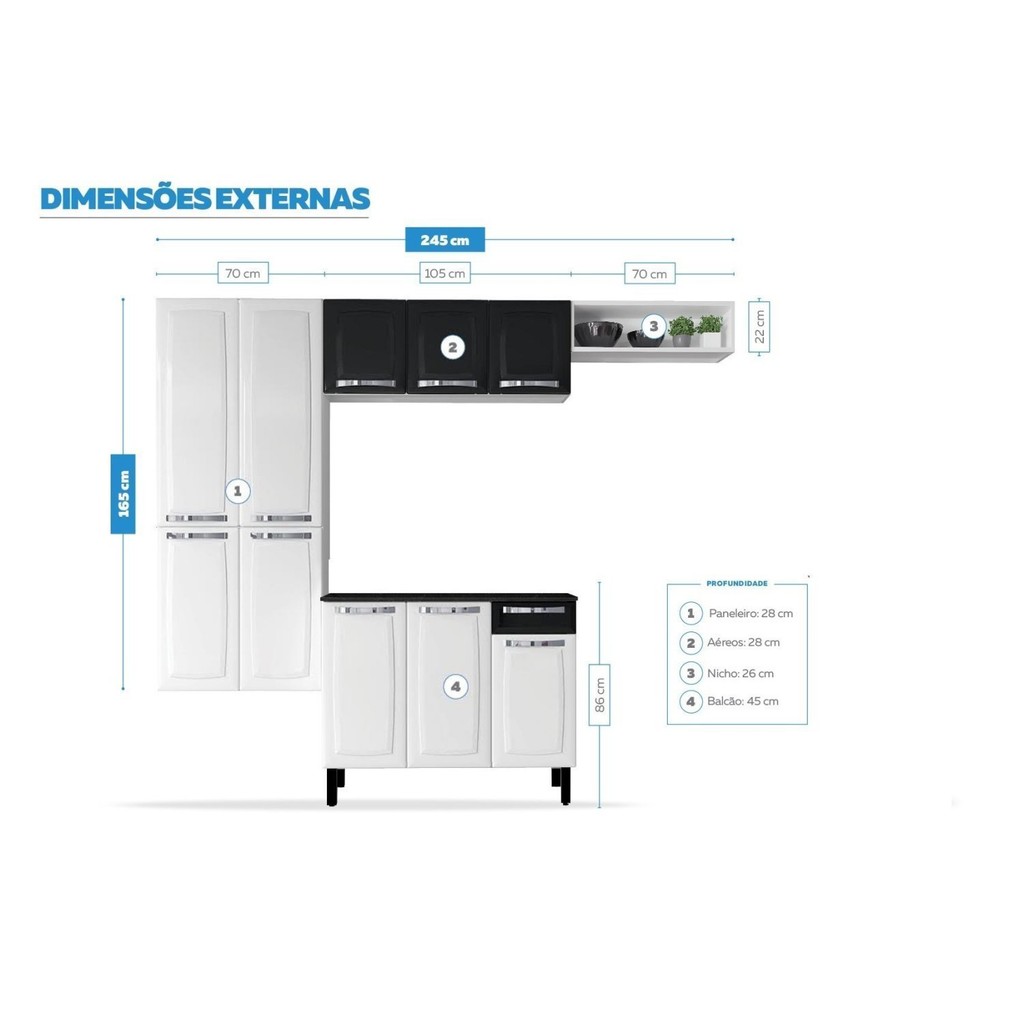 Com prateleiras bem divididas e aproveitamento eficiente para você guardar tudo, a linha rose é ideal para deixar a sua cozinha organizada. Beleza e design funcional: puxadores metalizados e modernos. Além de fáceis de manusear, são muito resistentes. Organização e bom gosto: opção de nicho para decorar. Beleza em cada detalhe: portas com estampo marcante e exclusivo. Nada de bagunça na cozinha: prateleiras bem-distribuídas para caber todos os utensílios e mantimentos. Proteção para durar mais: pintura eletrostática a pó, que dá brilho e protege o produto contra ferrugem e arranhões. Cuidado em cada detalhe: espaço interno na cor branca. TAMPO DE 15MM FABRICADO EM FF GRANITO ONIX Estilo: Clássico Modular: Sim Peso (kg): 51 Garantia: 12 Meses Altura (cm): 165 Acabamento: Pintura Largura (cm): 245 Possui Pés: Sim Possui Portas: Sim Tipo de Porta: Bater Altura dos Pés: 16 Pés Reguláveis: Sim Possui Gavetas: Sim Possui Rodízio: Não Suporta Até (kg): 80 Acompanha Tampo: Sim Profundidade (cm): 45 Escala de Brilho: Semi-Brilho Gaveta com Chave: Não Material dos Pés: Plástico Material da Porta: Aço Material do Fundo: Aço Material do Tampo: MDP Origem do Produto: Nacional Acabamento dos Pés: Pintura Ambiente Principal: Cozinha Balcão Suporta Pia: Não Material da Gaveta: Aço Material Principal: Aço Possui Prateleiras: Sim Acabamento da Porta: Pintura Quantidade de Peças: 4 Sapatas Niveladoras: Sim Acabamento da Gaveta: Pintura Balcão Acompanha Pia: Não Material da Corrediça: Metálica Material da Prateleira: Aço Peso Máximo por Gaveta: 2 Acabamento da Prateleira: Pintura Tipo de Puxador da Porta: Externo Escala de Brilho da Porta: Semi-Brilho Tipo de Puxador da Gaveta: Externo Escala de Brilho da Gaveta: Semi-Brilho Peso Máximo por Prateleira: 10 Tipo de Armário de Cozinha: Cozinha Compacta Possui Recorte para Cooktop: Não Tipo de Corrediça da Gaveta: Metálica Telescópica Material do Puxador da Porta: Plástico Material do Puxador da Gaveta: Plástico Escala de Brilho da Prateleira: Semi-Brilho Medida de Cada Item (A x L x P) (novo): Paneleiro 165x70x28cm | Armário 40x105x28cm | Nicho 22x70x26cm | Balcão 87x105x45cm Material da Dobradiça/Corrediça da Porta: Metálica Marca: Itatiaia Tonalidade: Preto / Branco Cor Interna: Branco Cor: Branco/Preto Cor do Produto: Branco/Preto Itens Inclusos: 1 Paneleiro, 1 Armário, 1 Nicho, 1 Balcão E Manual De Montagem. Cor Predominante: Preto Linha ou Coleção: Rose Quantidade de Prateleiras: 05 Prateleiras Quantidade de Portas: 10 Portas Quantidade de Gavetas: 03 Gavetas
