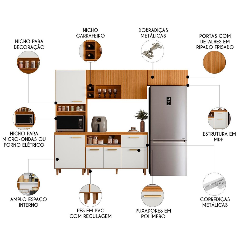 Cozinha Compacta Ema Freijó UV/Off Acetinado/Ripado Frisado Z44 - Mpozenato A Cozinha é o coração da casa, o lugar onde nascem receitas cheias de sabor e memórias afetivas em família. Pensando nisso, o Armário de Cozinha Ema, da Mpozenato, une funcionalidade e elegância para transformar o seu espaço do jeito que você merece. O Armário de Cozinha é composto por um Paneleiro com duas portas, um compartimento para micro-ondas ou forno elétrico e um nicho para temperos. O Armário Aéreo conta com três portas com detalhe em ripado frisado, além de um nicho decorativo e dois nichos adega para acomodar seus rótulos favoritos. Já o Armário de Geladeira acompanha duas portas com o mesmo detalhe ripado, garantindo um visual harmonioso. O Balcão possui três portas e uma gaveta com corrediças telescópicas, que permitem abertura total, facilitando o aceso aos itens armazenados. Seu tampo serve como apoio para eletrodomésticos, como a cafeteira, criando um cantinho do café charmoso, e o nicho organizador logo abaixo confere praticidade ao design, ideal para armazenar pequenos objetos. As dobradiças metálicas reforçadas proporcionam uma abertura suave, enquanto os puxadores agregam um toque de sofisticação e destaque. Fabricado em MDP com acabamento em pintura UV, oferece resistência e durabilidade contra o desgaste do dia a dia. E para completar, os pés em PVC são reguláveis, o que possibilita ajustar pequenos desníveis de piso e manter a estabilidade do produto. Não perca a chance de renovar sua casa com estilo. Aproveite e adicione agora mesmo a Cozinha Compacta ao seu carrinho! Especificações Dimensões do Produto: Largura: 260 cm. Altura: 206 cm. Profundidade: Superior: 29 cm/Inferior: 38 cm. Peso: 76,5 Kg. Outras medidas: (L x A x P) Paneleiro: 60 x 206 x 38 cm. Armário Aéreo 120cm: 120 x 54 x 29 cm. Armário Aéreo 80cm: 80 x 25 x 29 cm. Balcão: 120 x 84 x 38 cm. Espaço Livre Micro-ondas: 55 x 40 x 37 cm. Características do Produto Material da Estrutura: MDP 12mm. Material do Fundo: HDF 3mm. Peso Suportado: 53 Kg distribuídos. Acompanha Tampo: Sim. Acabamento: Pintura UV. Escala de Brilho: Fosco acetinado. Possui Portas: Sim. Quantidade de Portas: 10 Portas. Tipo de Porta: Convencional. Material das Dobradiças: Metálicas. Possui Gavetas: Sim. Quantidade de Gavetas: 1 Gaveta. Tipo de Corrediças: Metálicas. Possui Puxador: Sim. Material do Puxador: Polímero. Possui Prateleiras: Sim. Quantidade de Prateleiras: 3 Prateleiras. Possui Nichos: Sim. Quantidade de Nichos: 6 Nichos. Possui Pés: Sim. Quantidade de Pés: 9 Pés. Material dos Pés: PVC. Altura dos Pés: 15,5cm com regulagem. Diferenciais: - Design moderno. - Nicho para micro-ondas ou forno elétrico. - Nichos para decoração. - Portas dos armários com detalhe em ripado frisado. - Dobradiças e corrediças metálicas. - Pés com regulagem de 15,5 à 17cm. Sistema de Montagem: Cavilhas/Parafusos. Manual de Montagem: Sim. Complexidade da Montagem: Alta. Conteúdo da Embalagem: 1 Cozinha Compacta, 1 Balcão. Garantia do Fabricante: 90 dias contra defeitos de fabricação. Volumes: 3 Volumes. Montagem: Recomendamos que seja feita por um profissional. Recomendação de Limpeza: Utilize pano levemente úmido. Observações importantes: - Produto para uso residencial em ambiente interno, não devendo ficar exposto diretamente ao sol, calor e umidades excessivas. - Pode haver alguma diferença de tonalidade entre a imagem e o produto real, por conta do tratamento de imagens e a calibração de cores do seu monitor. - As imagens são meramente ilustrativas, não acompanham objetos de decoração e eletrônicos. - Ao receber a mercadoria, o cliente deve verificar as condições da embalagem, caso haja algum problema não assine o comprovante de recebimento. - Montagem, desmontagem e outras instalações serão de responsabilidade do cliente. Não nos responsabilizamos, no ato da entrega, por subir escadas/elevadores ou pelo transporte por guincho em apartamentos. Eventuais despesas são de responsabilidade do comprador. - Confira as dimensões do produto e certifique-se de que passará normalmente por supostos elevadores, portas, escadas e/ou corredores de sua residência.